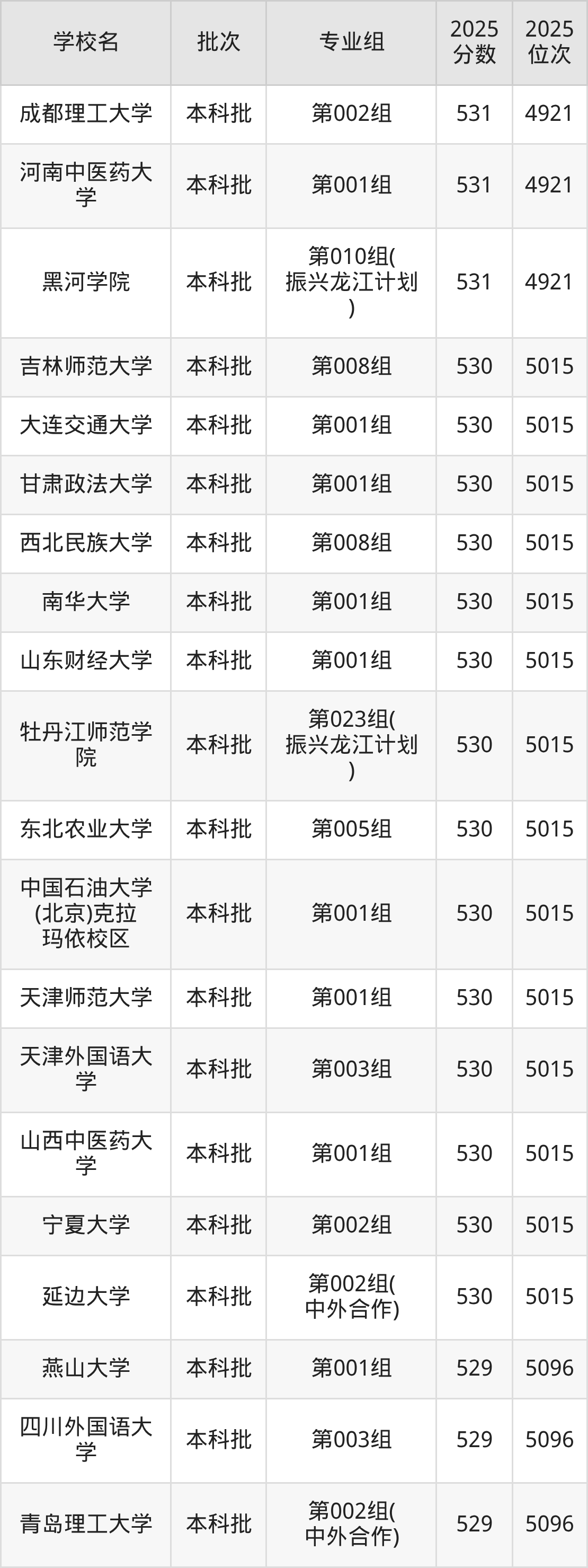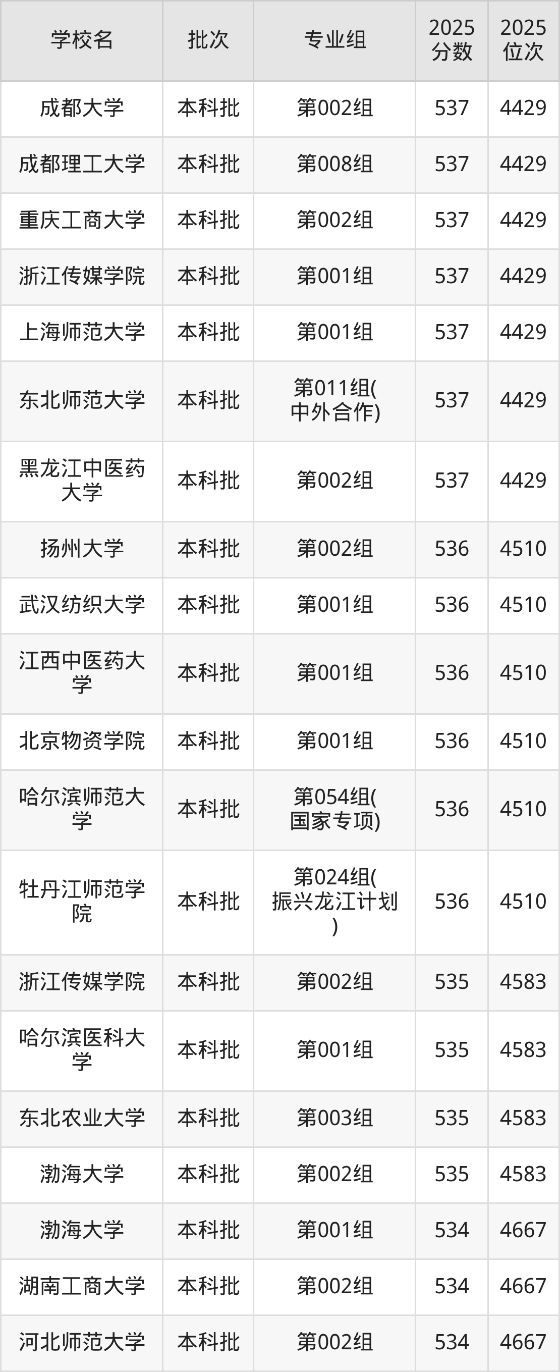 2025年黑龙江高考历史类534分(4584名~4667名)能上的大学有河北师范大学第002组、渤海大学第001组、齐齐哈尔大学第038组(振兴龙江计划)、牡丹江师范学院第025组(振兴龙江计划)等。