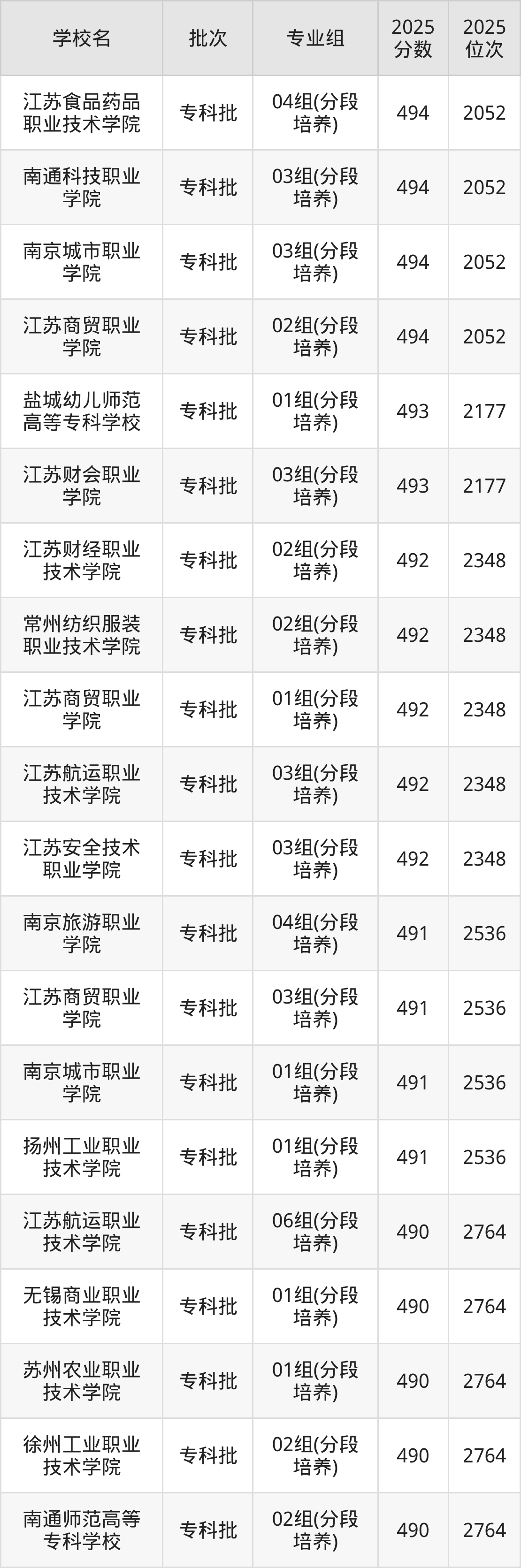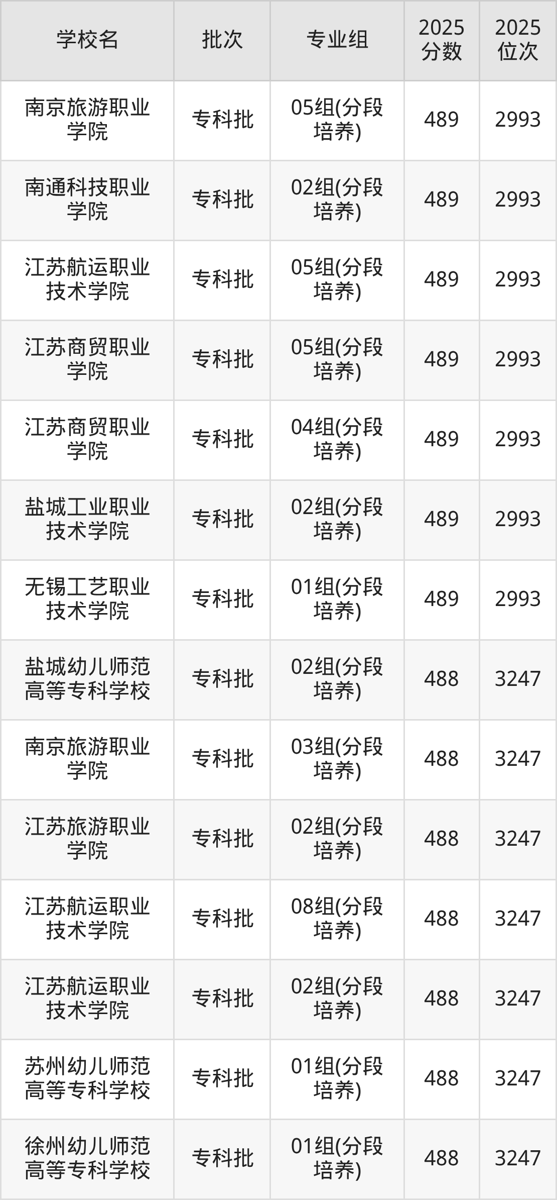 另外录取位次低于该区间(较稳妥)的有南京旅游职业学院05组(分段培养)(2993名)、盐城工业职业技术学院02组(分段培养)(2993名)等;录取位次高于该区间(可冲)的有南京传媒学院01组(52005名)、吉利学院01组(52005名)等。