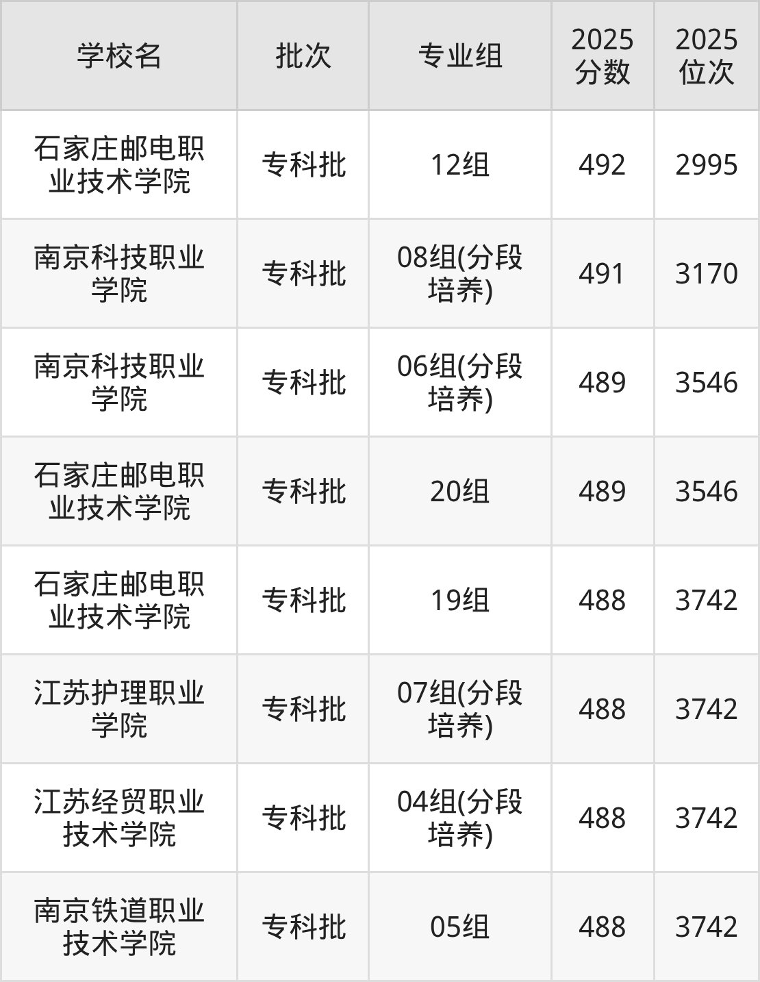 另外录取位次低于该区间(较稳妥)的有石家庄邮电职业技术学院20组(3546名)、南京科技职业学院06组(分段培养)(3546名)等;录取位次高于该区间(可冲)的有西安明德理工学院02组(174488名)、苏州大学应用技术学院03组(174488名)等。