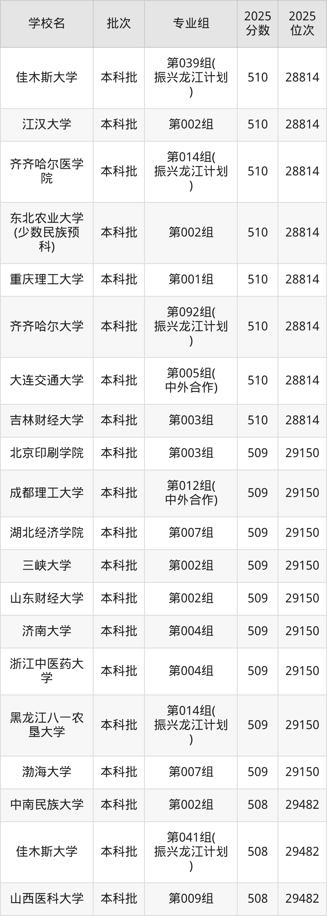 2025年黑龙江高考物理类509分(28815名~29150名)能上的大学有北京印刷学院第003组、渤海大学第007组、黑龙江八一农垦大学第014组(振兴龙江计划)、浙江中医药大学第004组等。