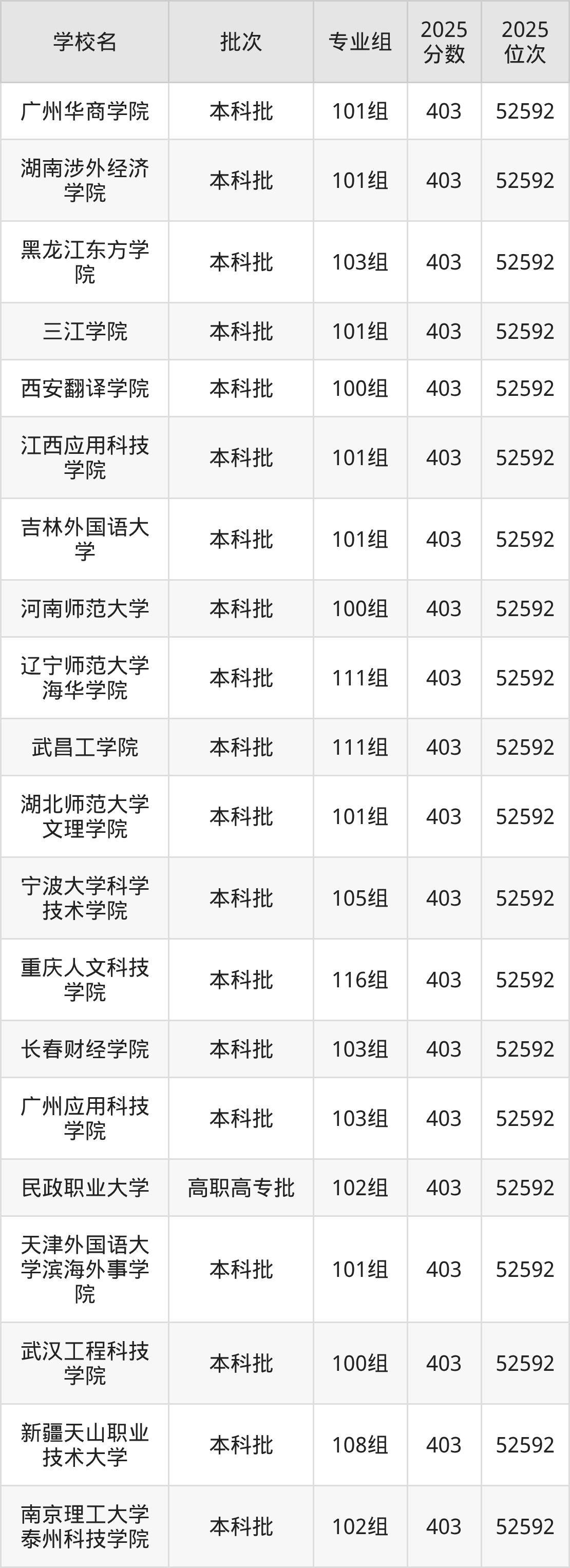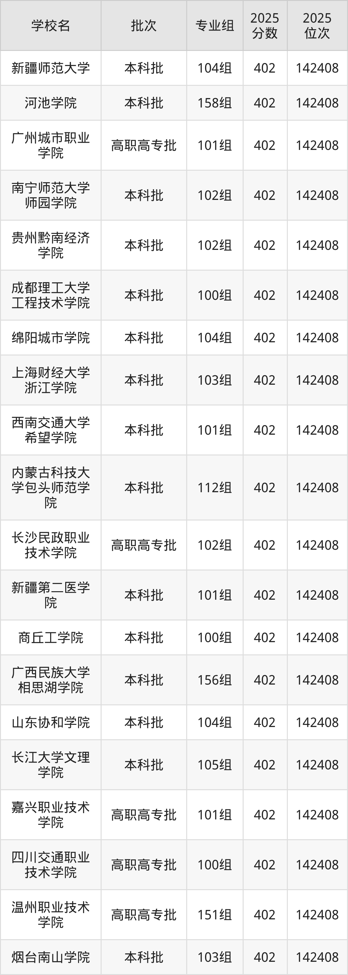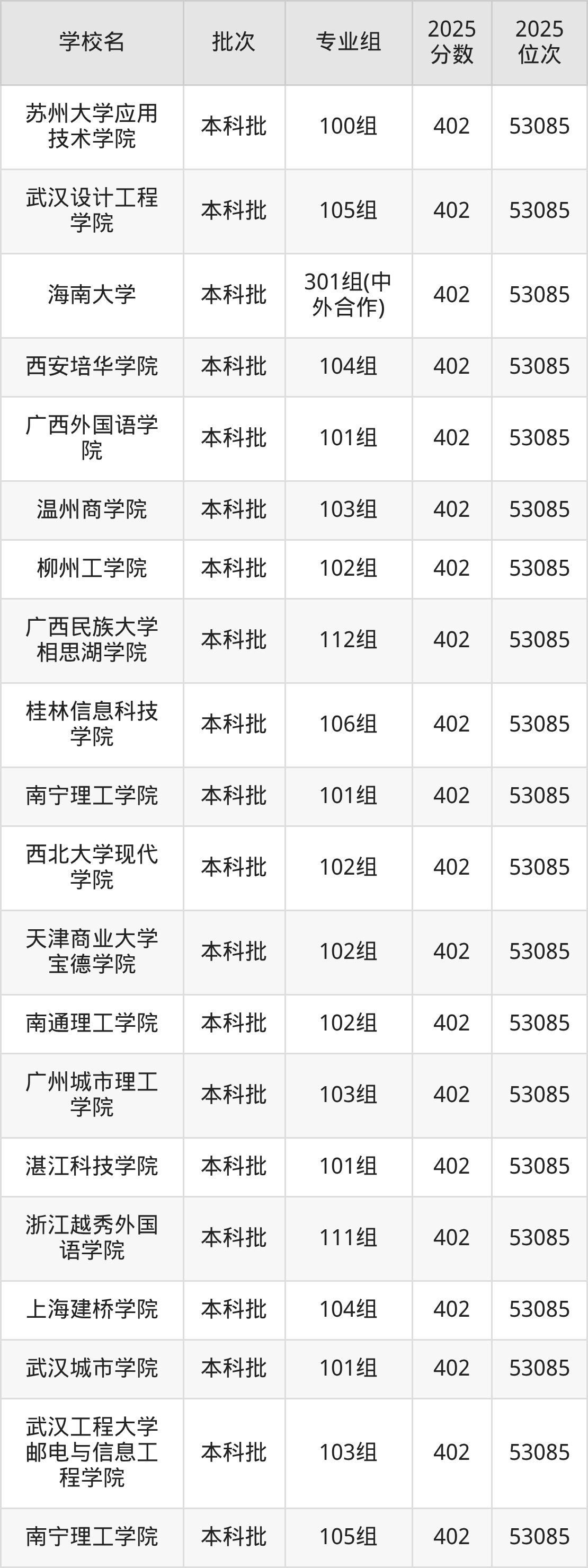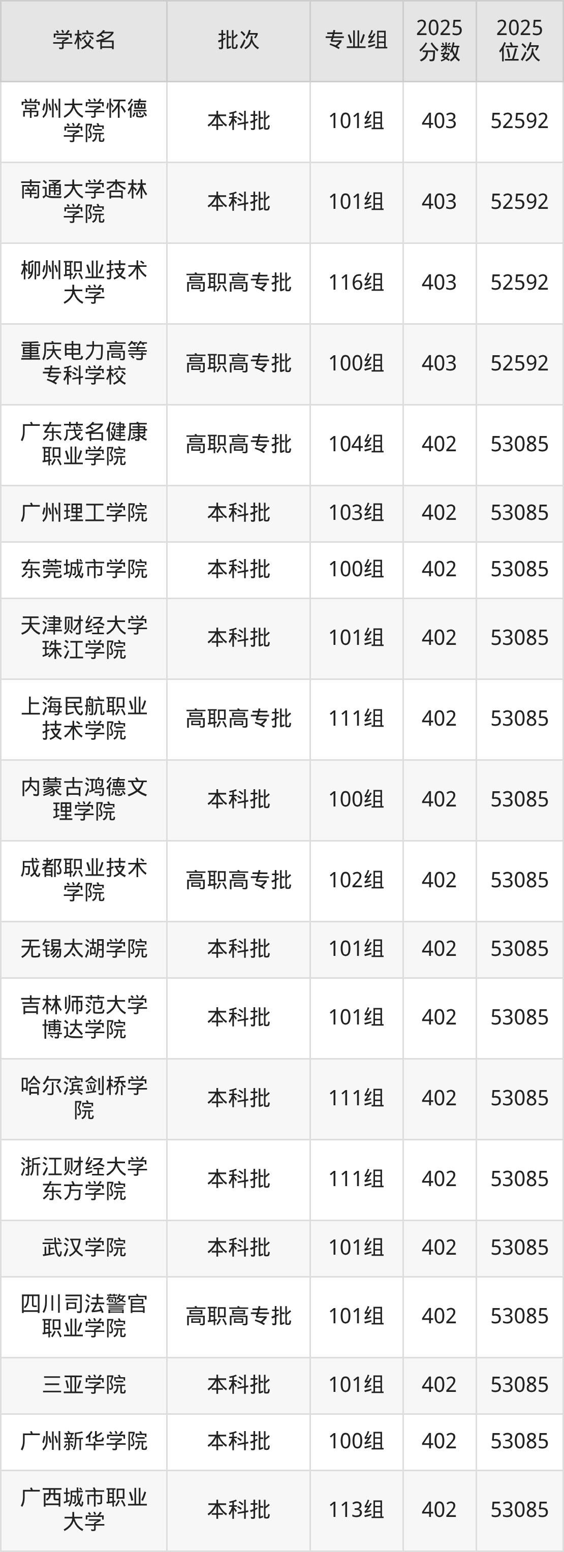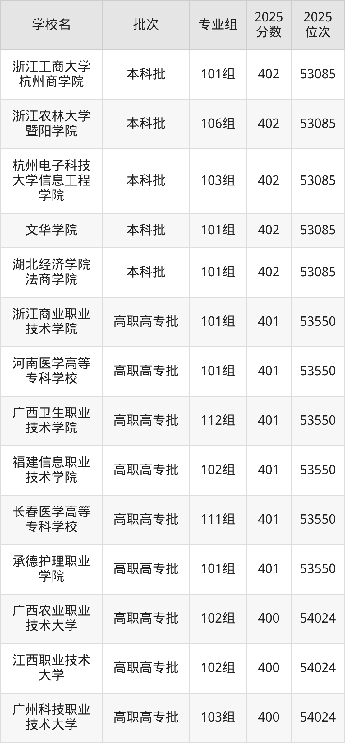 2025年广西高考历史类401分(53086名~53550名)能上的大学有长春医学高等专科学校111组、福建信息职业技术学院102组、浙江商业职业技术学院101组、承德护理职业学院101组等。