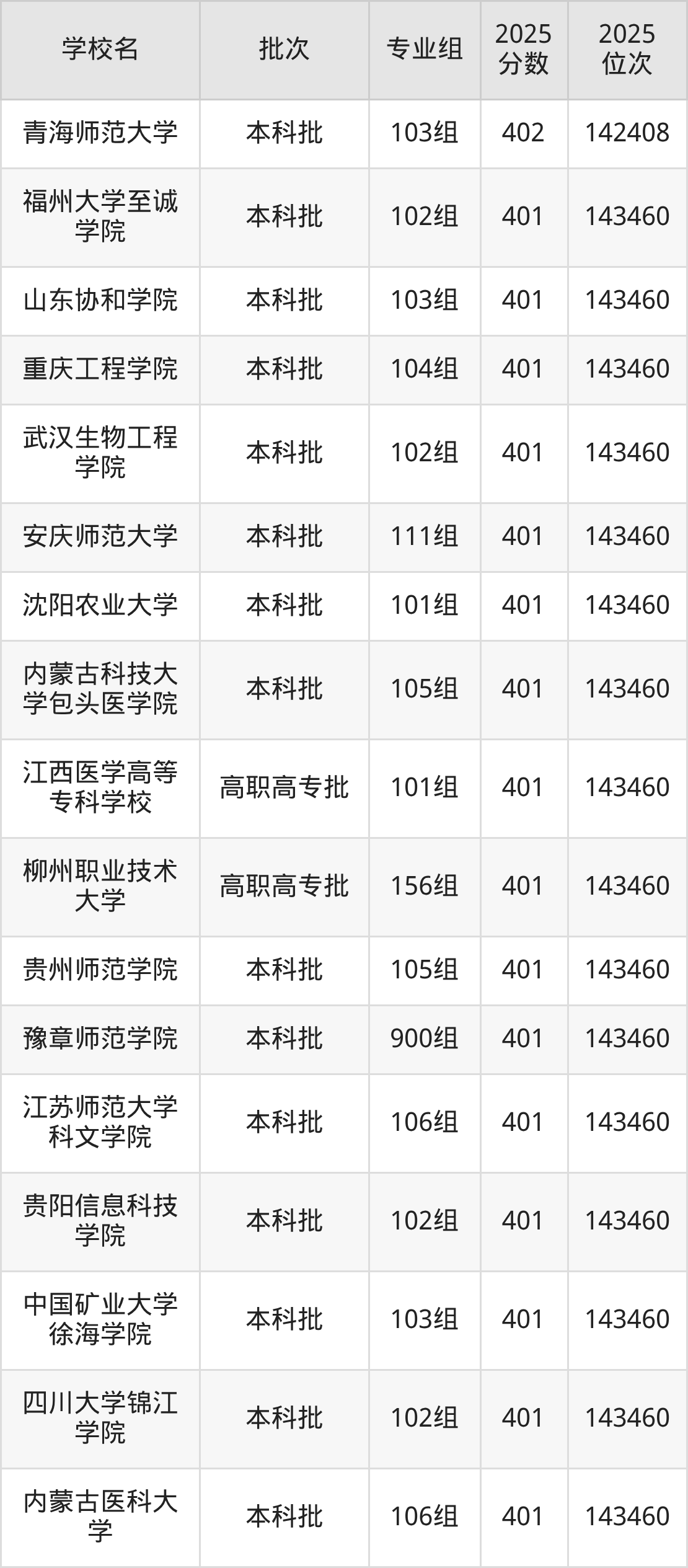 2025年广西高考物理类401分(142409名~143460名)能上的大学有内蒙古医科大学106组、沈阳农业大学101组、安庆师范大学111组、武汉生物工程学院102组等。