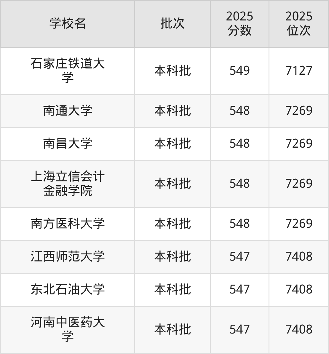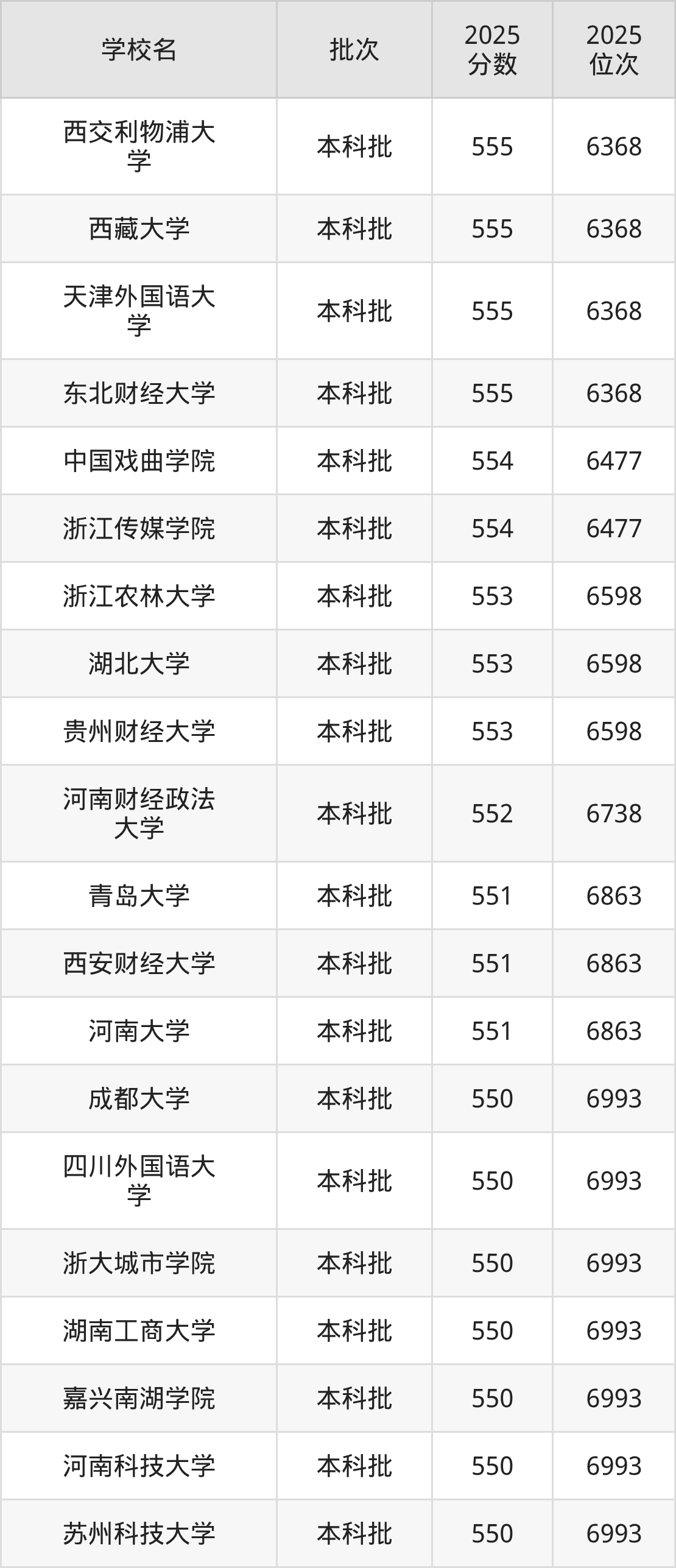 2025年辽宁高考历史类550分(6864名~6993名)能上的大学有嘉兴南湖学院、河南科技大学、苏州科技大学、成都大学等。