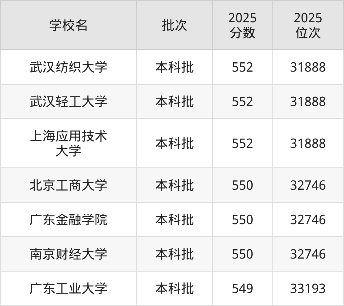 另外录取位次低于该区间(较稳妥)的有广东工业大学(33193名)、广西大学(33652名)等;录取位次高于该区间(可冲)的有上海应用技术大学(31888名)、武汉轻工大学(31888名)等。