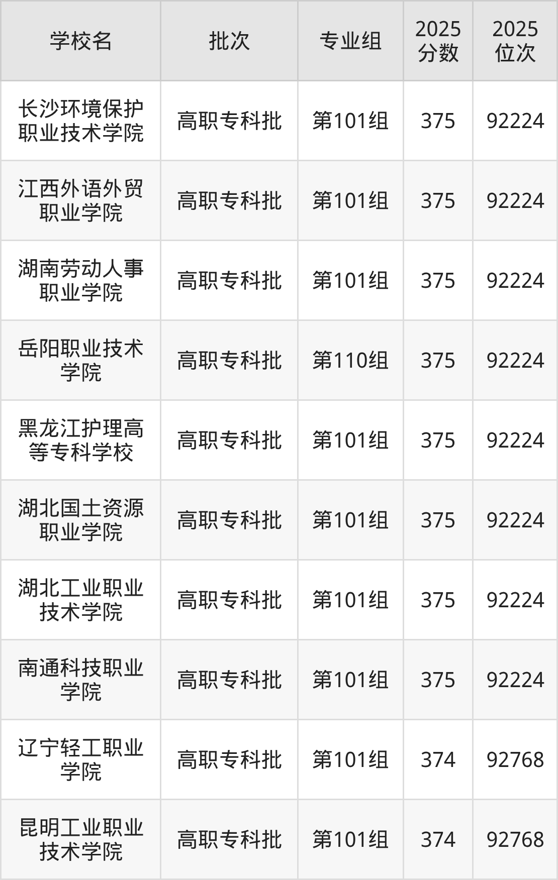 2025年湖南高考历史类374分(92225名~92768名)能上的大学有辽宁轻工职业学院第101组、昆明工业职业技术学院第101组。