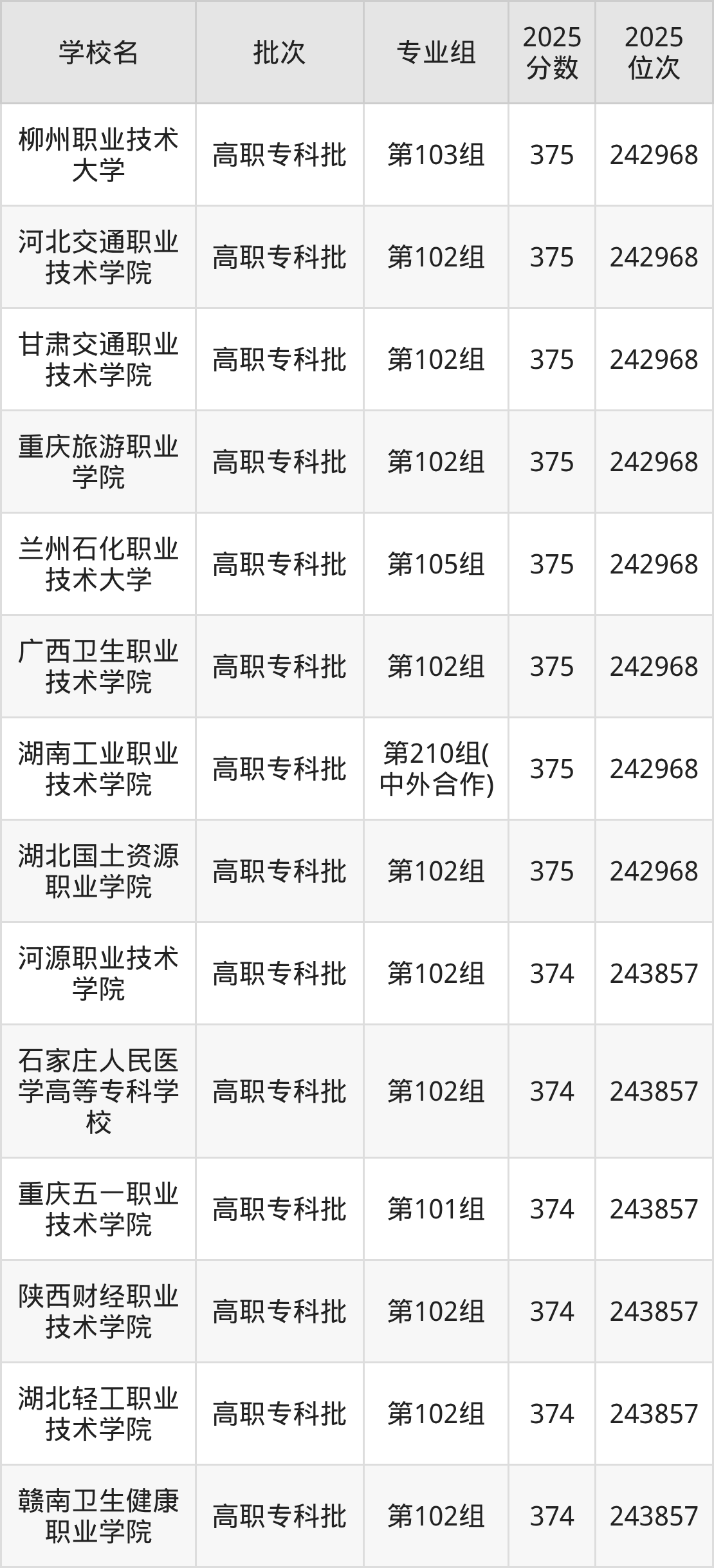 2025年湖南高考物理类374分(242969名~243857名)能上的大学有石家庄人民医学高等专科学校第102组、赣南卫生健康职业学院第102组、湖北轻工职业技术学院第102组、河源职业技术学院第102组等。