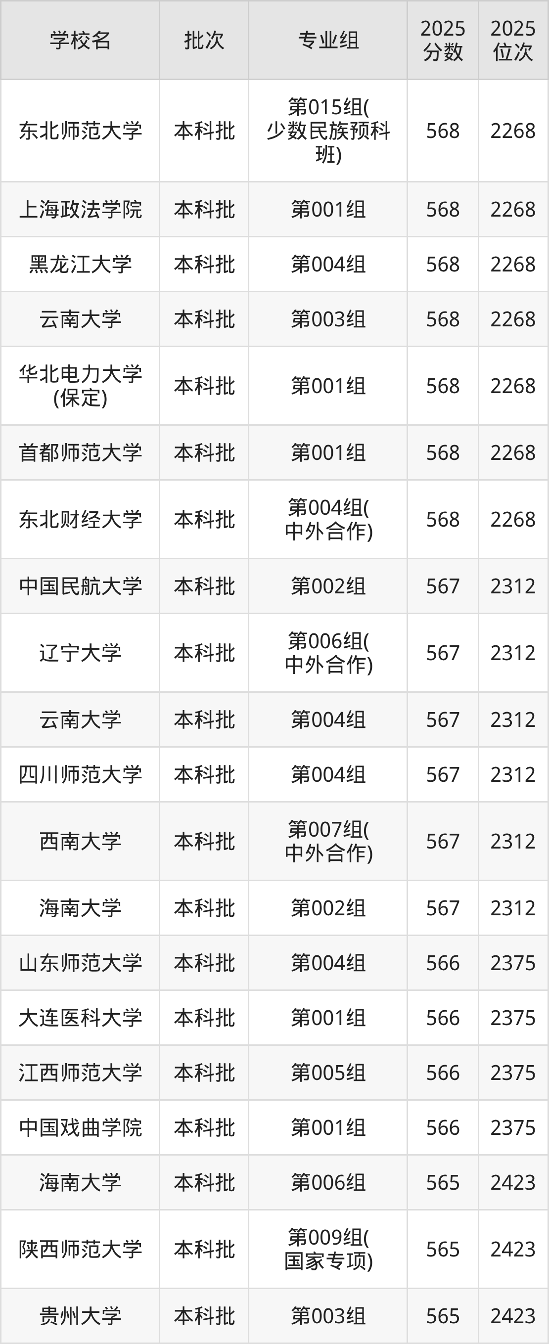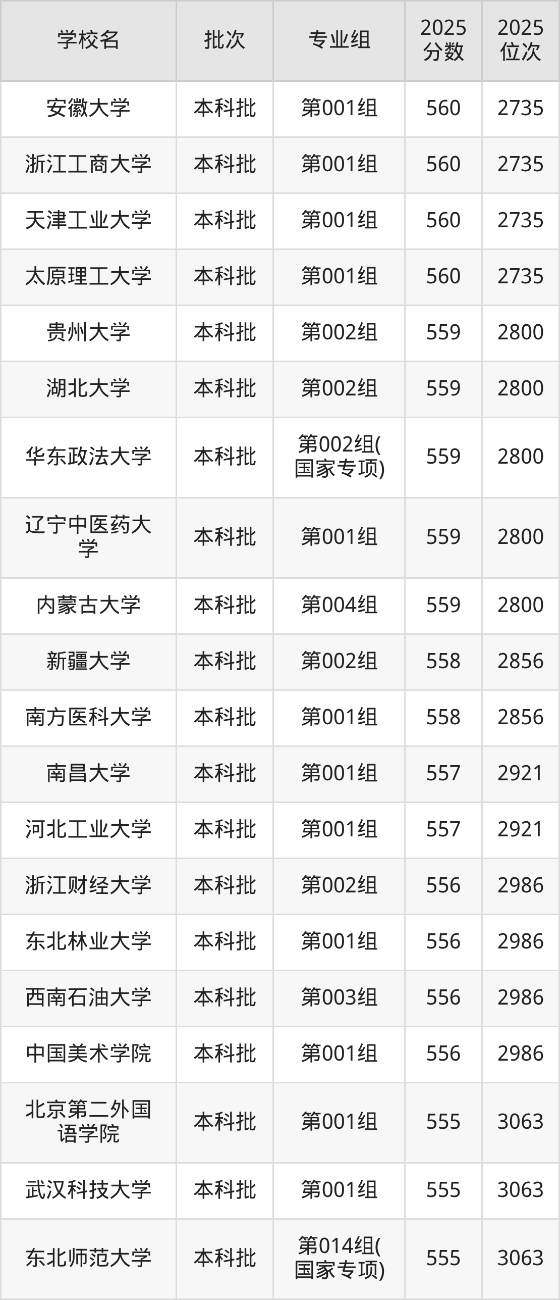2025年黑龙江高考历史类559分(2736名~2800名)能上的大学有内蒙古大学第004组、辽宁中医药大学第001组、华东政法大学第002组(国家专项)、湖北大学第002组等。