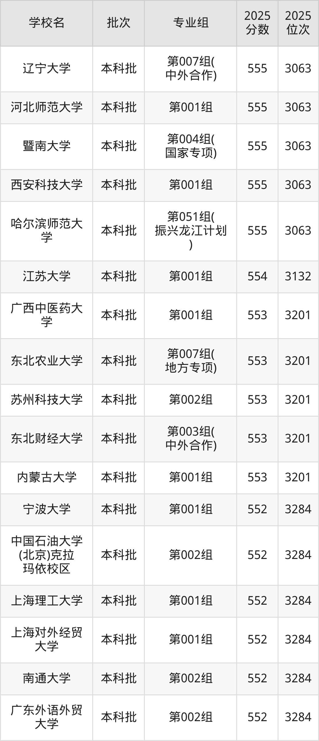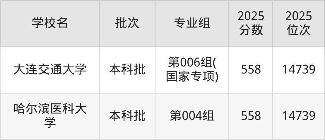 2025年黑龙江高考物理类559分(14207名~14473名)能上的大学有北京中医药大学第004组、大连医科大学第002组、东北师范大学第025组(中外合作)、东北电力大学第012组等。