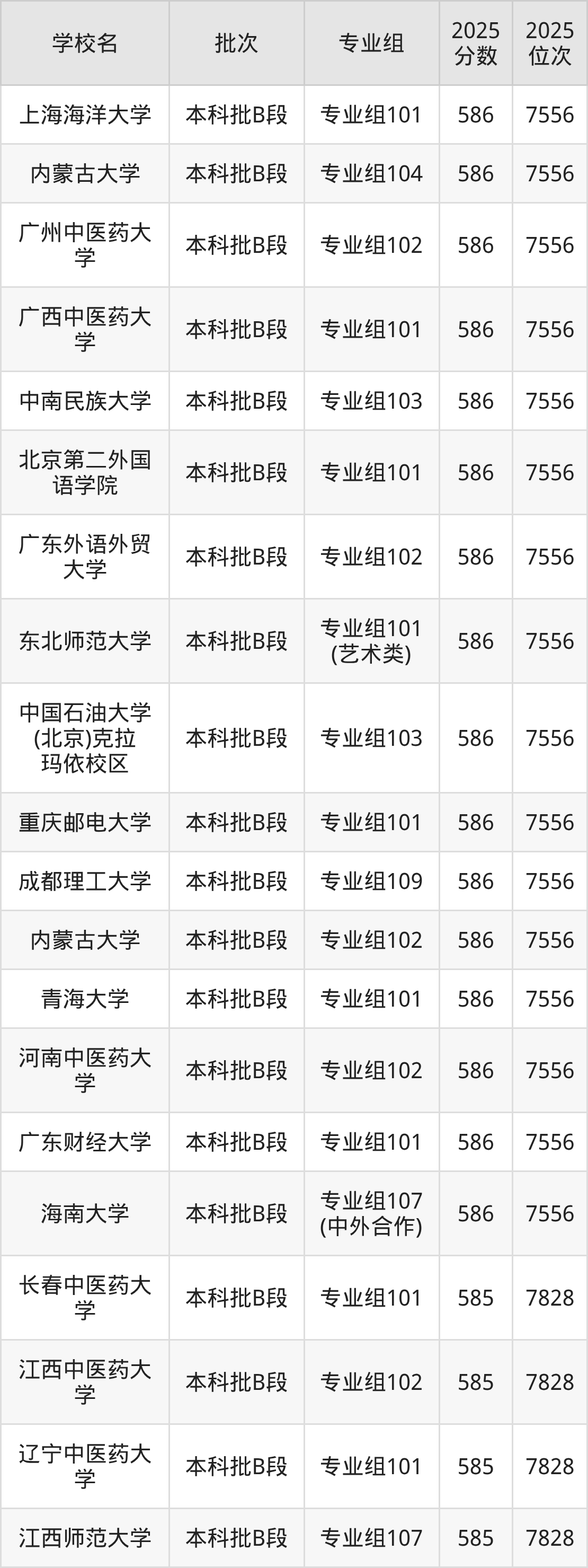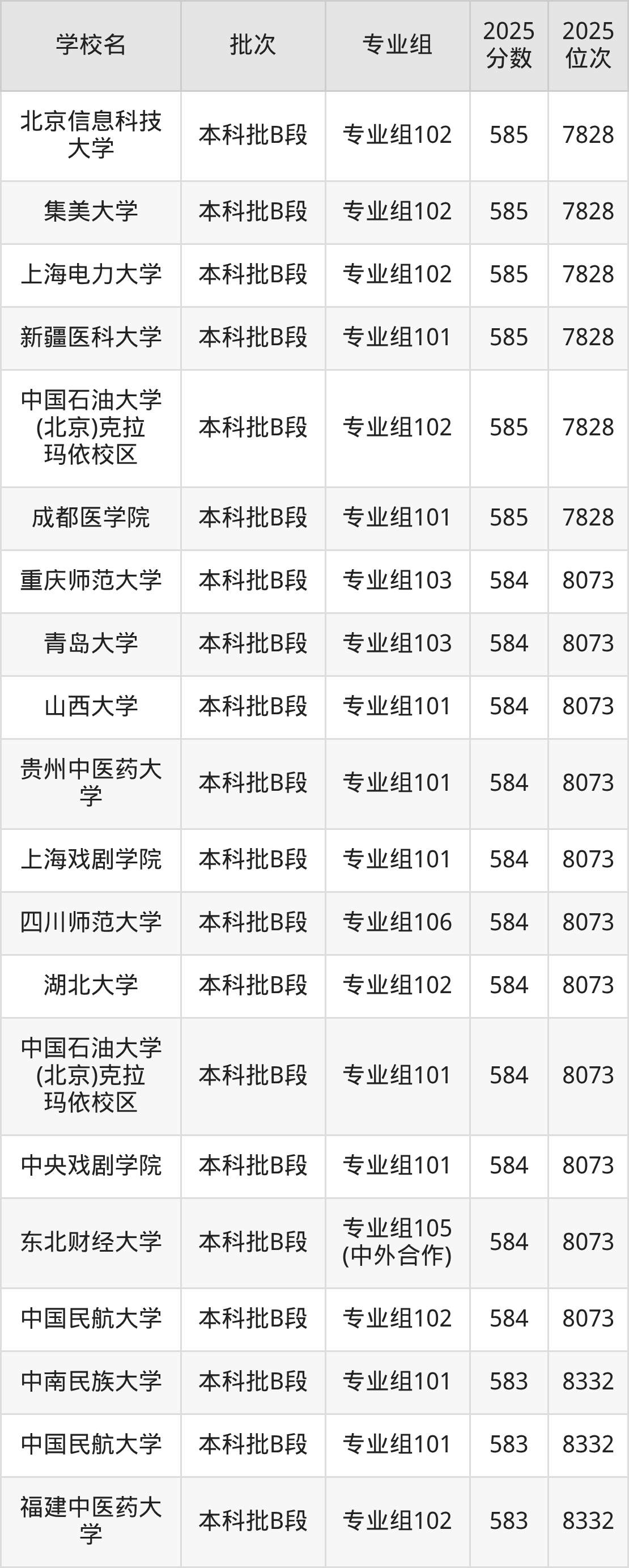 另外录取位次低于该区间(较稳妥)的有福建中医药大学专业组102(8332名)、中国民航大学专业组101(8332名)等;录取位次高于该区间(可冲)的有中国石油大学(北京)克拉玛依校区专业组102(7828名)、长春中医药大学专业组101(7828名)等。