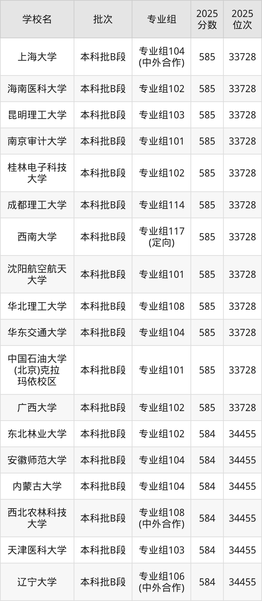 2025年四川高考物理类584分(33729名~34455名)能上的大学有安徽师范大学专业组104、内蒙古大学专业组104、西北农林科技大学专业组108(中外合作)、天津医科大学专业组103等。