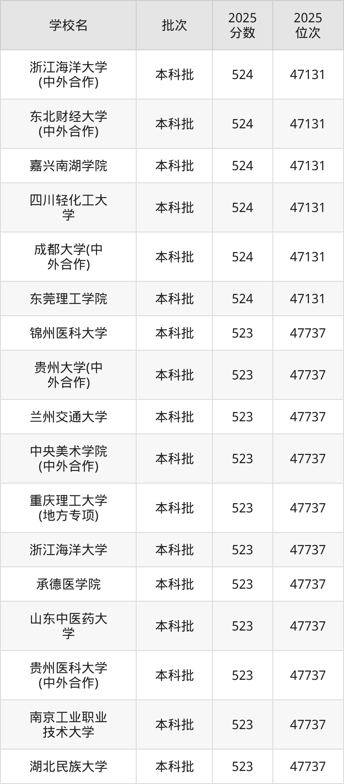2025年重庆高考物理类523分(47132名~47737名)能上的大学有湖北民族大学、南京工业职业技术大学、贵州医科大学(中外合作)、浙江海洋大学等。