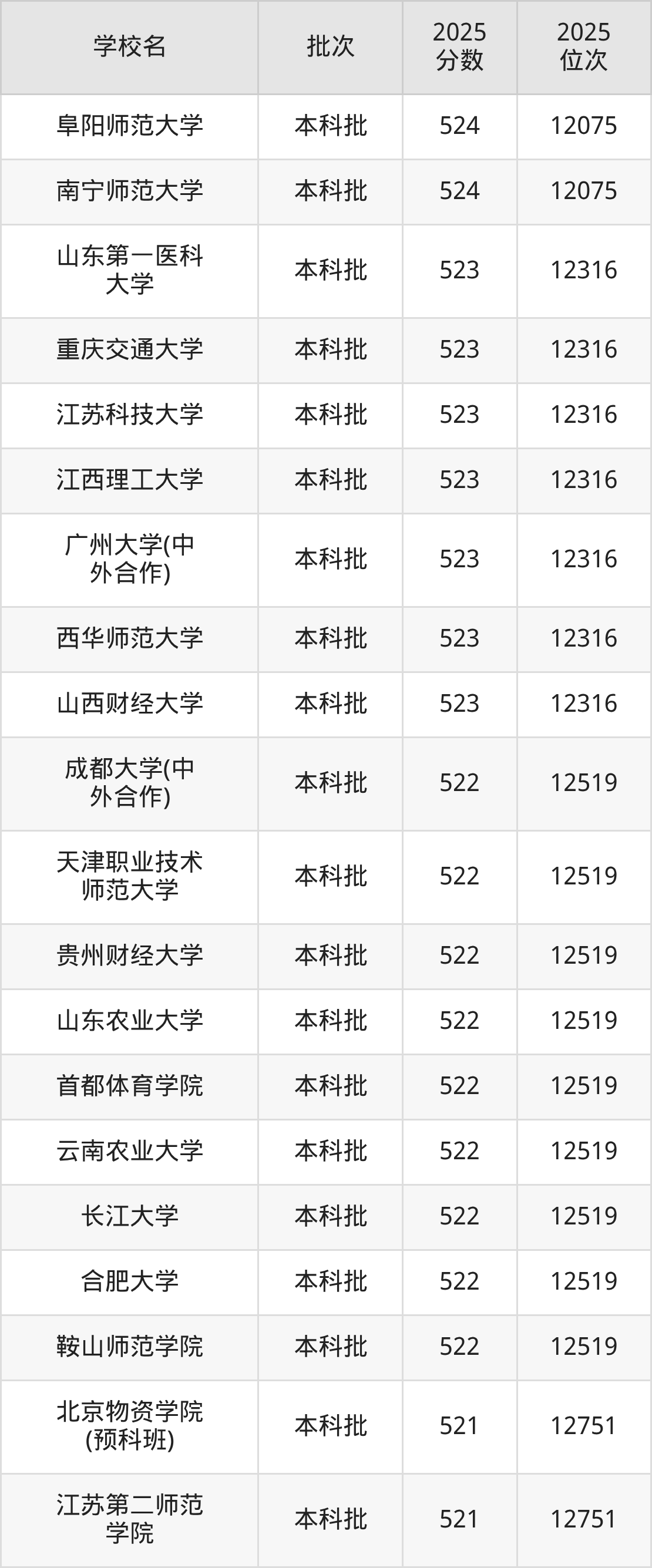 2025年重庆高考历史类523分(12076名~12316名)能上的大学有山东第一医科大学、山西财经大学、广州大学(中外合作)、西华师范大学等。
