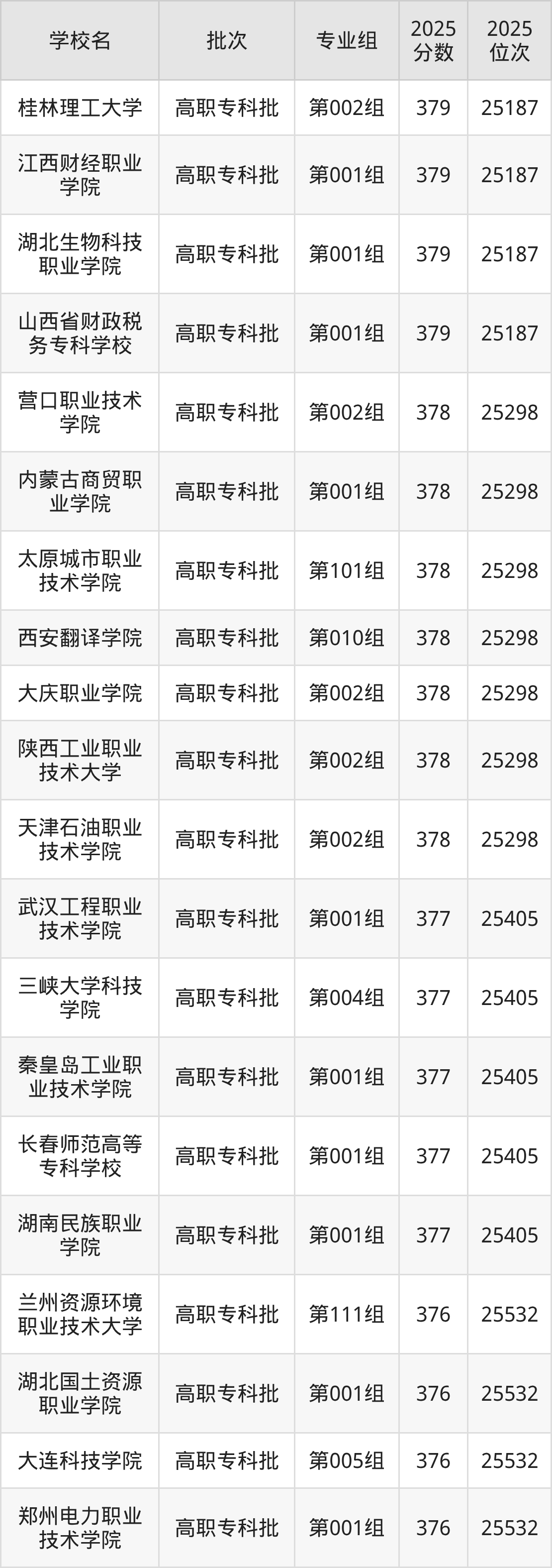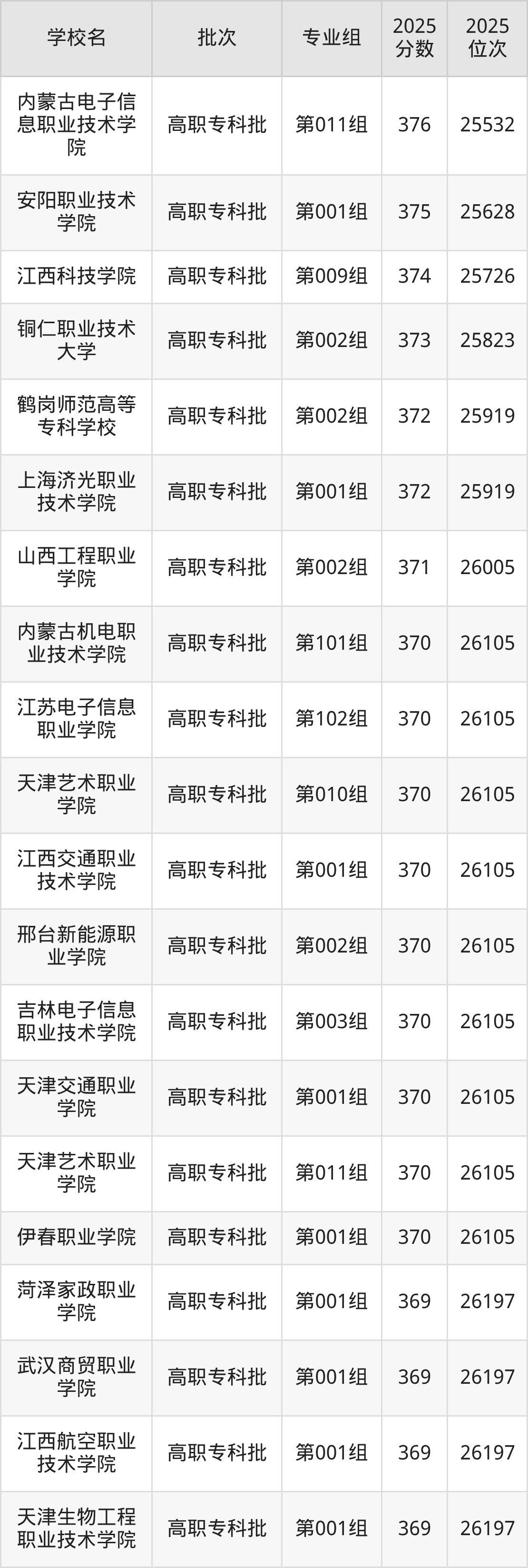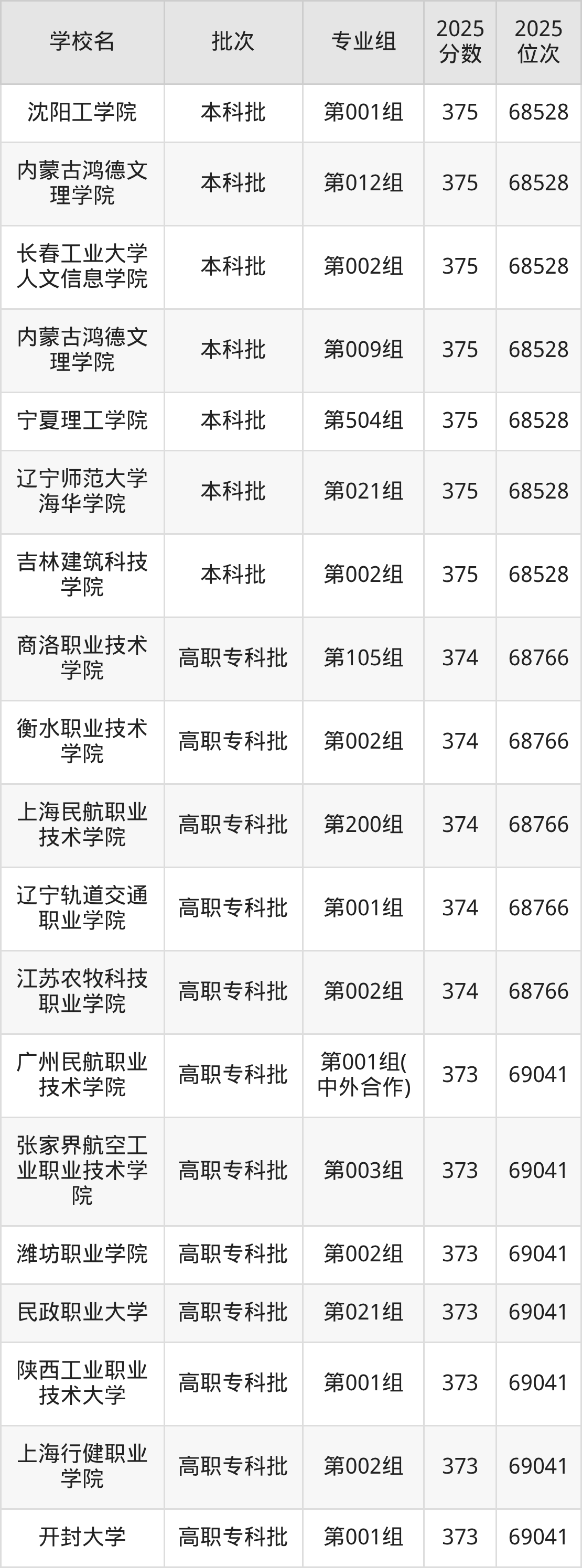 2025年内蒙古高考物理类374分(68529名~68766名)能上的大学有江苏农牧科技职业学院第002组、辽宁轨道交通职业学院第001组、上海民航职业技术学院第200组、衡水职业技术学院第002组等。