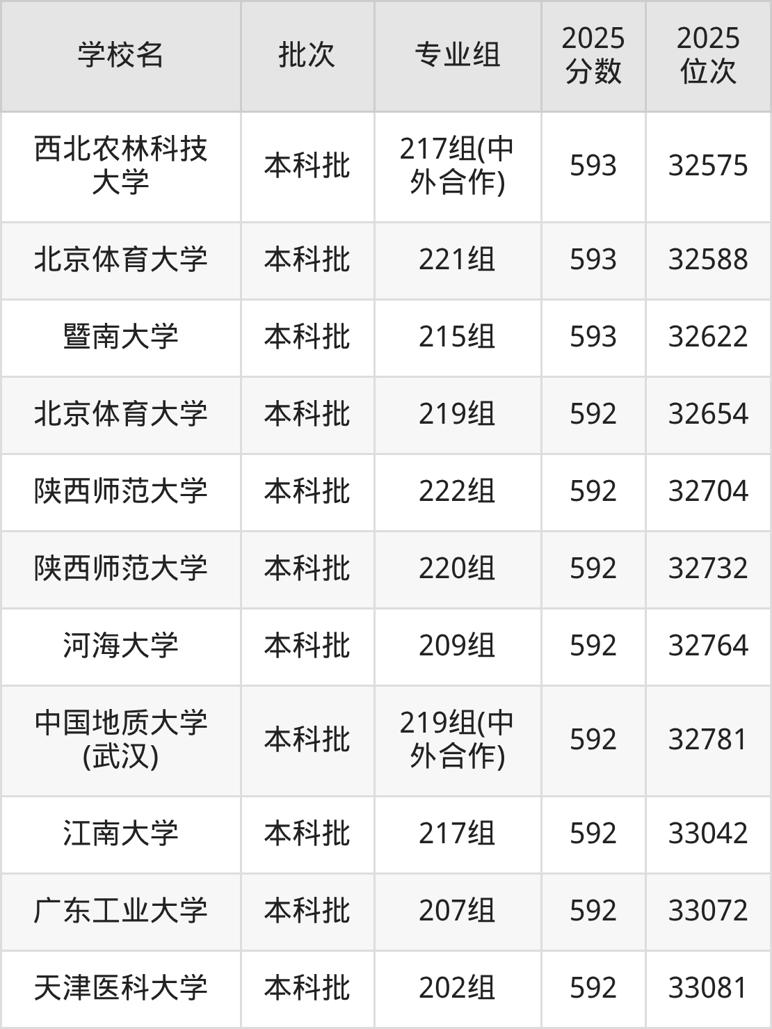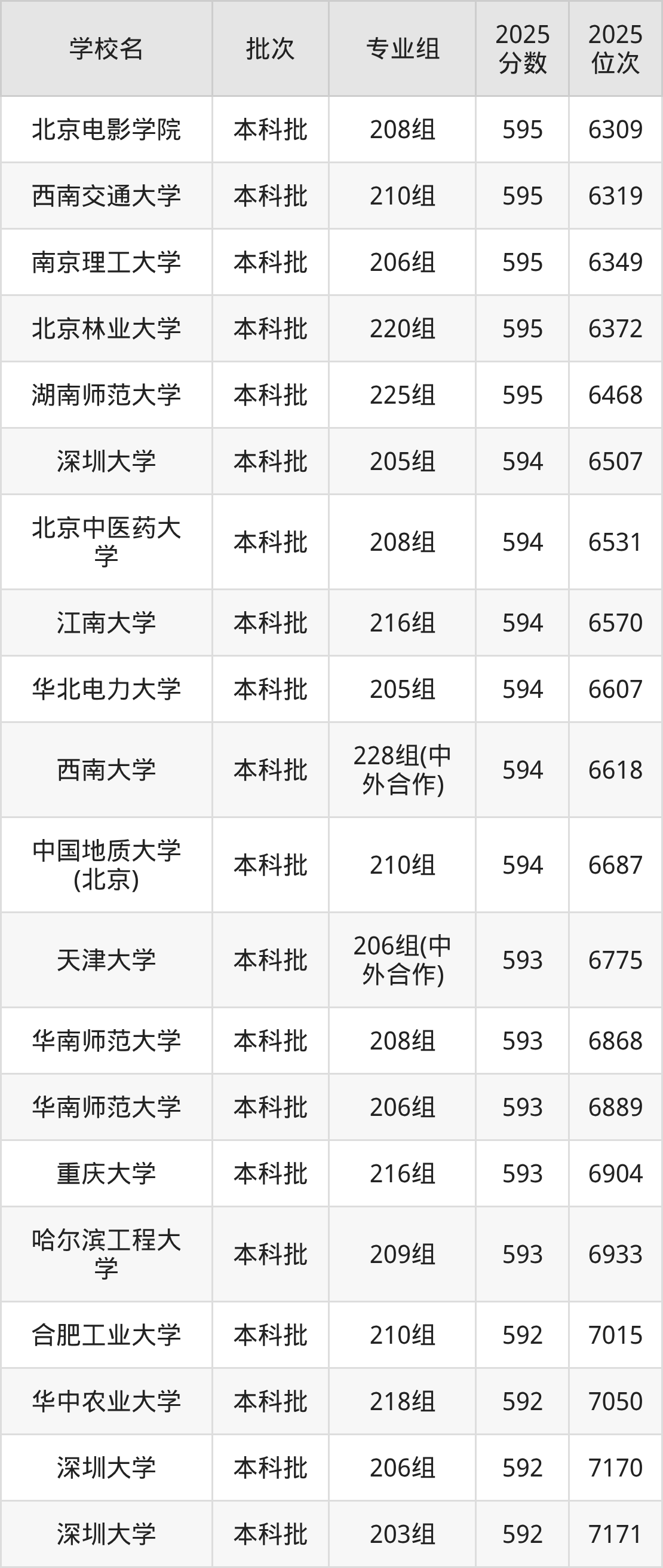 2025年广东高考历史类593分(6741名~6999名)能上的大学有天津大学206组(中外合作)、哈尔滨工程大学209组、华南师范大学206组、华南师范大学208组等。