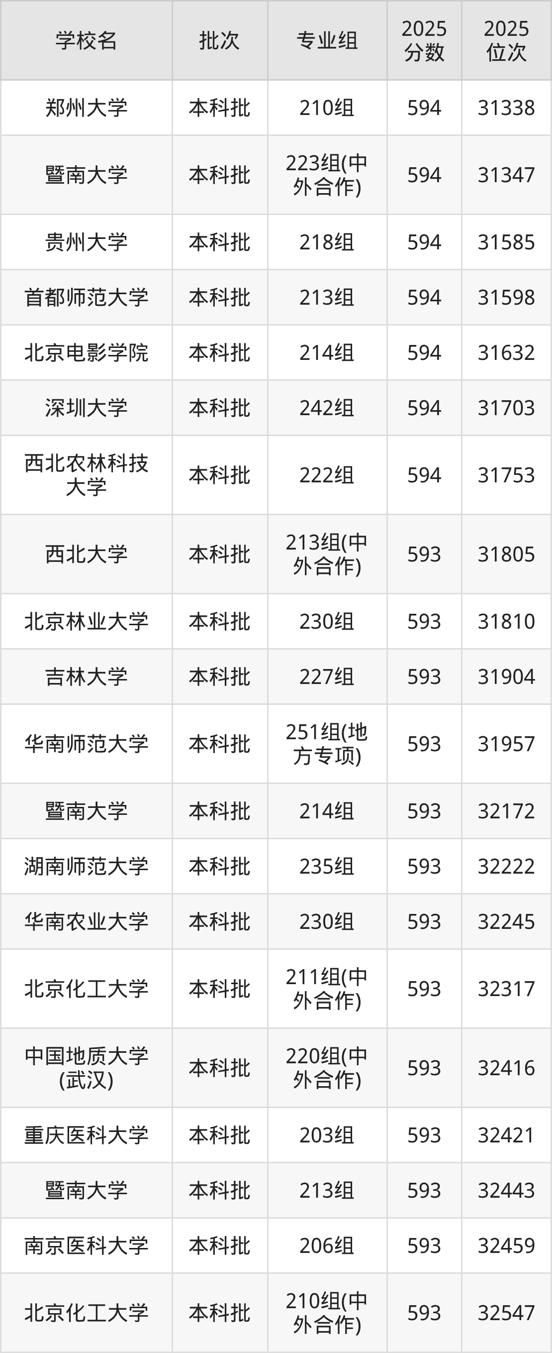 2025年广东高考物理类593分(31761名~32651名)能上的大学有北京化工大学210组(中外合作)、北京化工大学211组(中外合作)、北京林业大学230组、北京体育大学221组等。