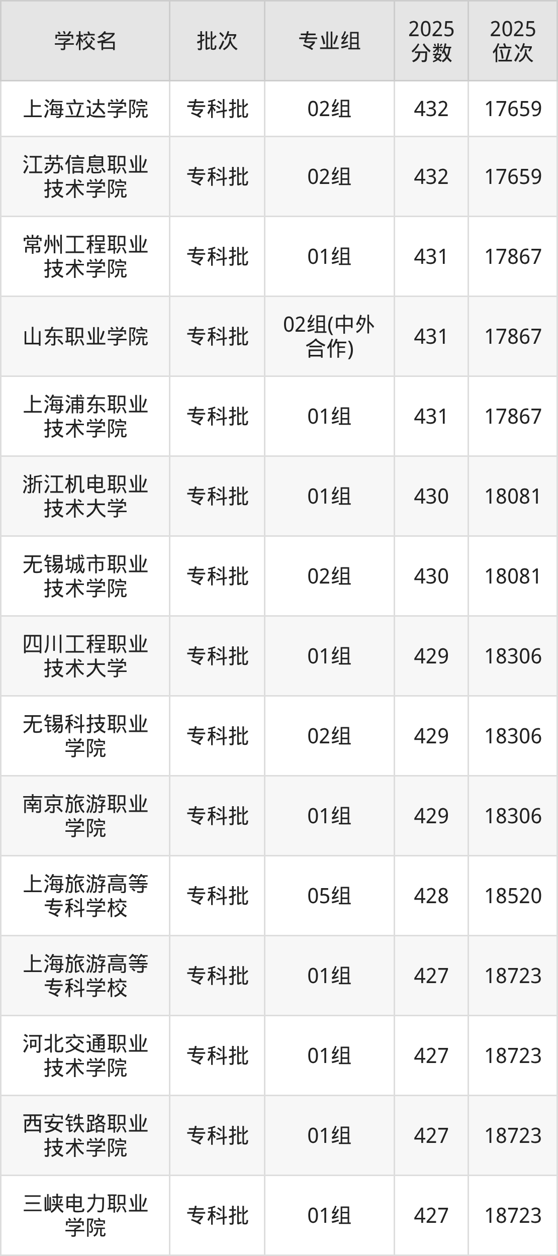 2025年江苏高考历史类429分(18082名~18306名)能上的大学有南京旅游职业学院01组、无锡科技职业学院02组、四川工程职业技术大学01组。