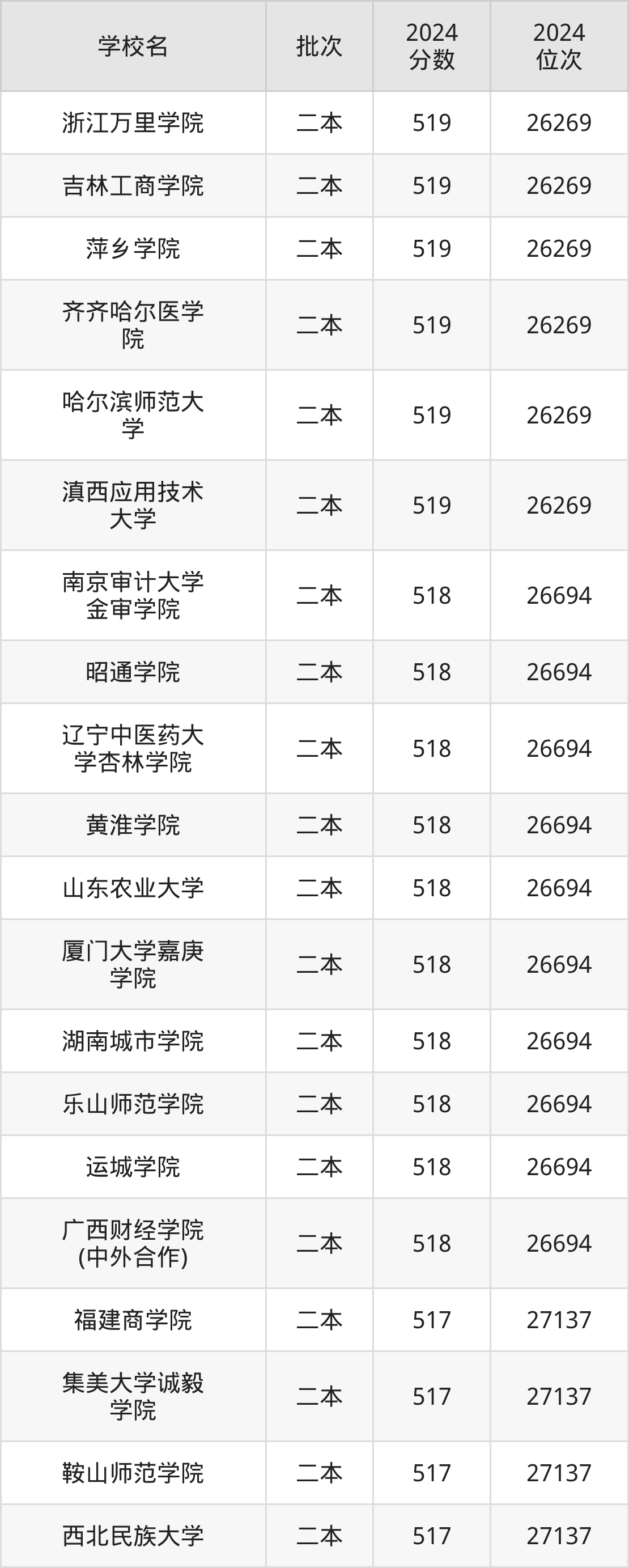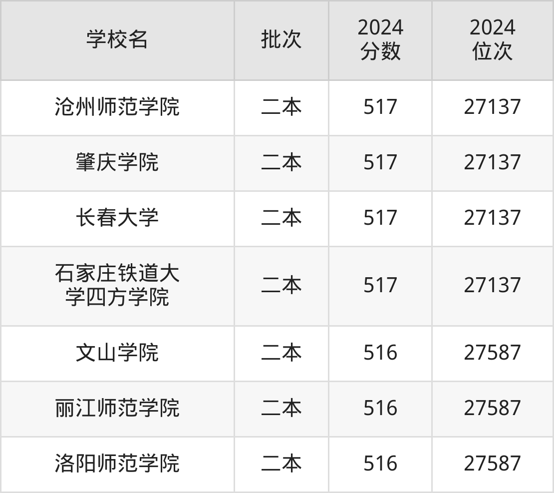 这些都是2025年高考文科26695名~27137名考生可以报考的大学,更多学校名单如下表所示: