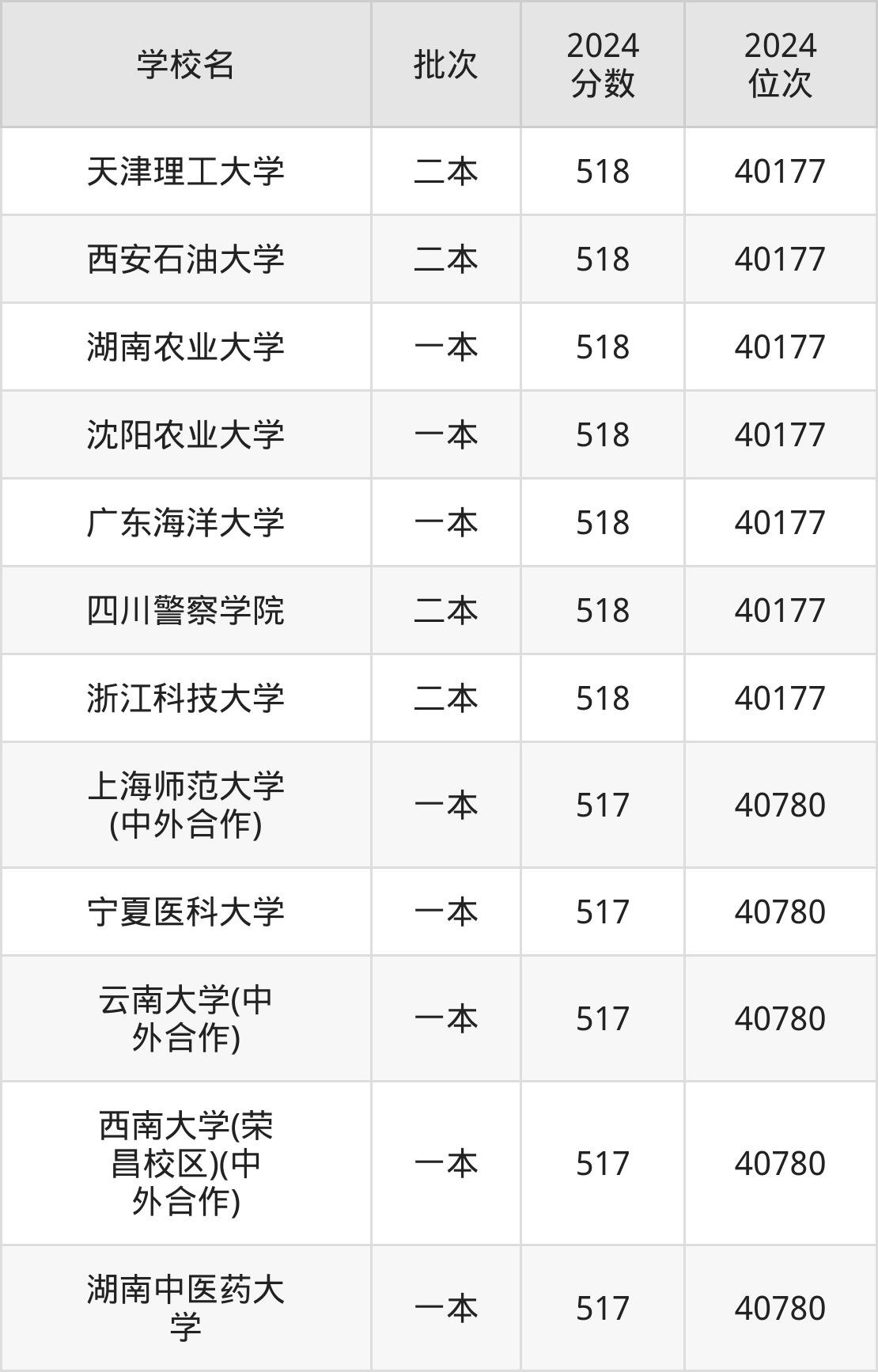 2024年云南高考理科517分(40178名~40780名)能上的大学有云南大学(中外合作)、上海师范大学(中外合作)、西南大学(荣昌校区)(中外合作)、湖南中医药大学等。