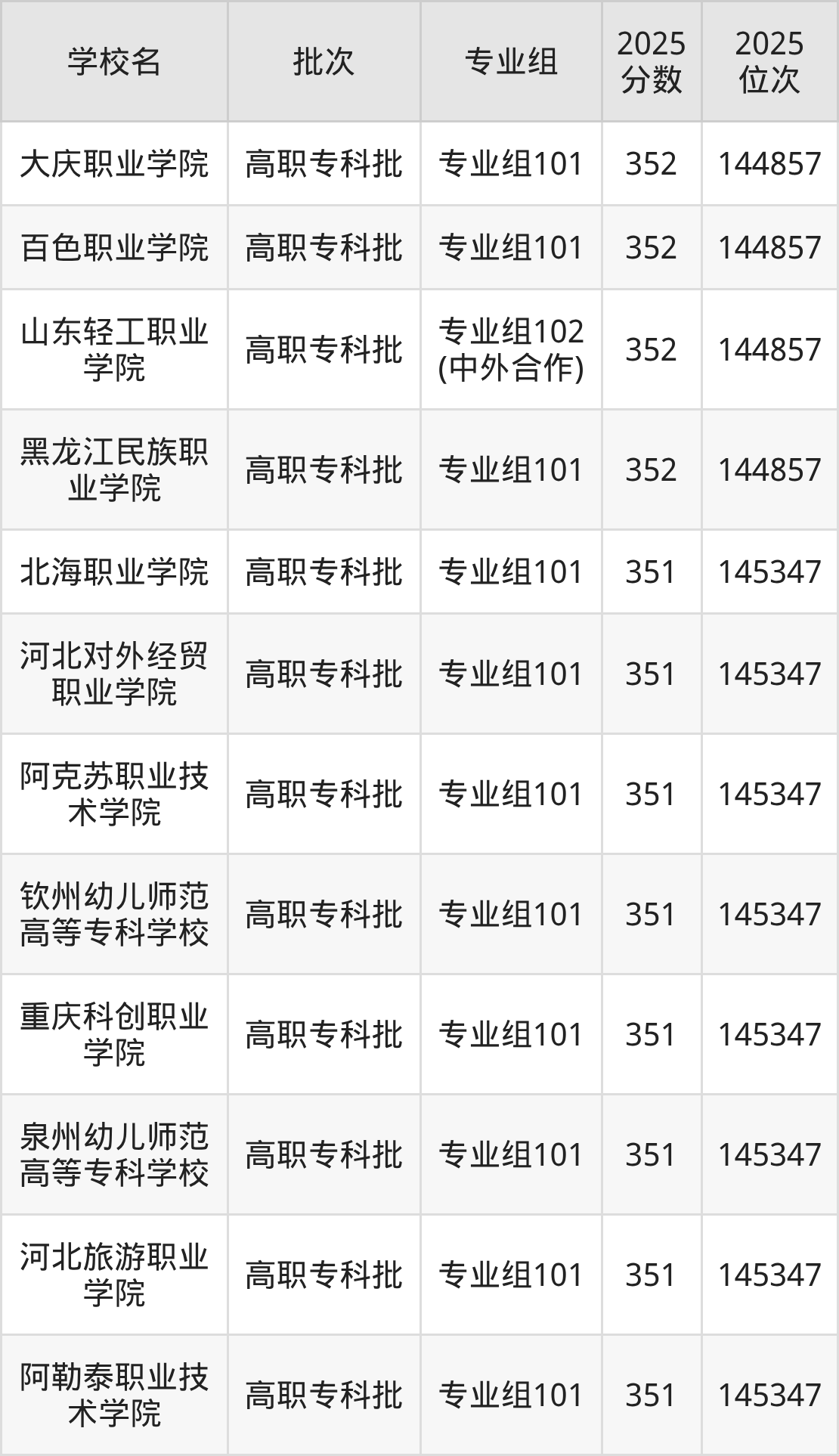 另外录取位次低于该区间(较稳妥)的有上海东海职业技术学院专业组101(145860名)、可克达拉职业技术学院专业组107(145860名)等;录取位次高于该区间(可冲)的有黑龙江民族职业学院专业组101(144857名)、百色职业学院专业组101(144857名)等。