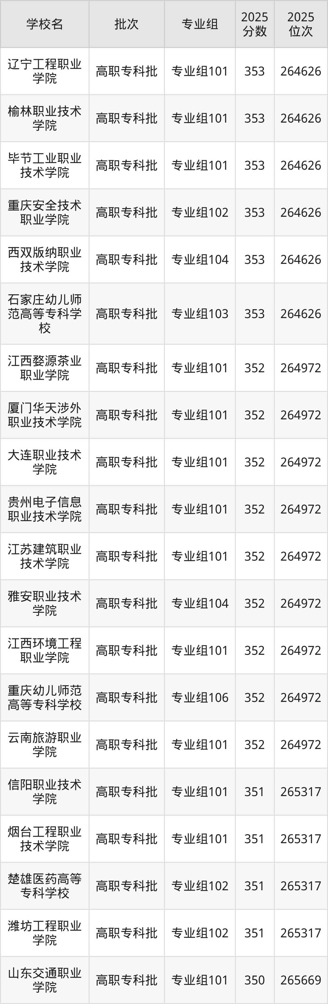 2025年四川高考物理类351分(264973名~265317名)能上的大学有潍坊工程职业学院专业组102、楚雄医药高等专科学校专业组102、信阳职业技术学院专业组101、烟台工程职业技术学院专业组101。