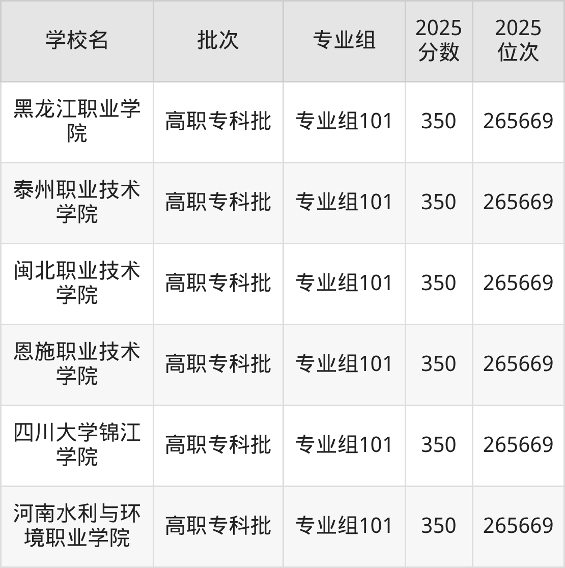 另外录取位次低于该区间(较稳妥)的有河南水利与环境职业学院专业组101(265669名)、四川大学锦江学院专业组101(265669名)等;录取位次高于该区间(可冲)的有云南旅游职业学院专业组101(264972名)、重庆幼儿师范高等专科学校专业组106(264972名)等。