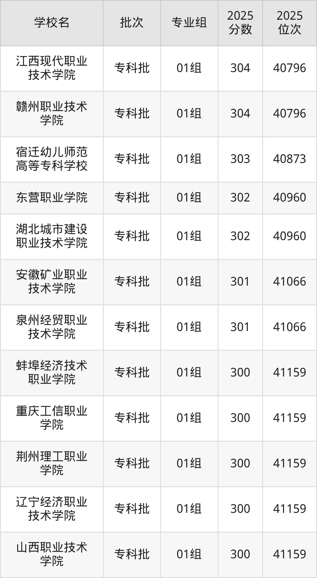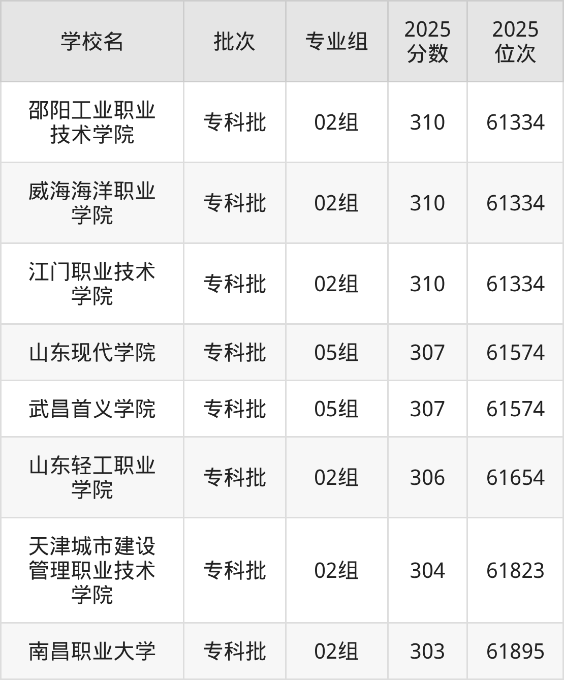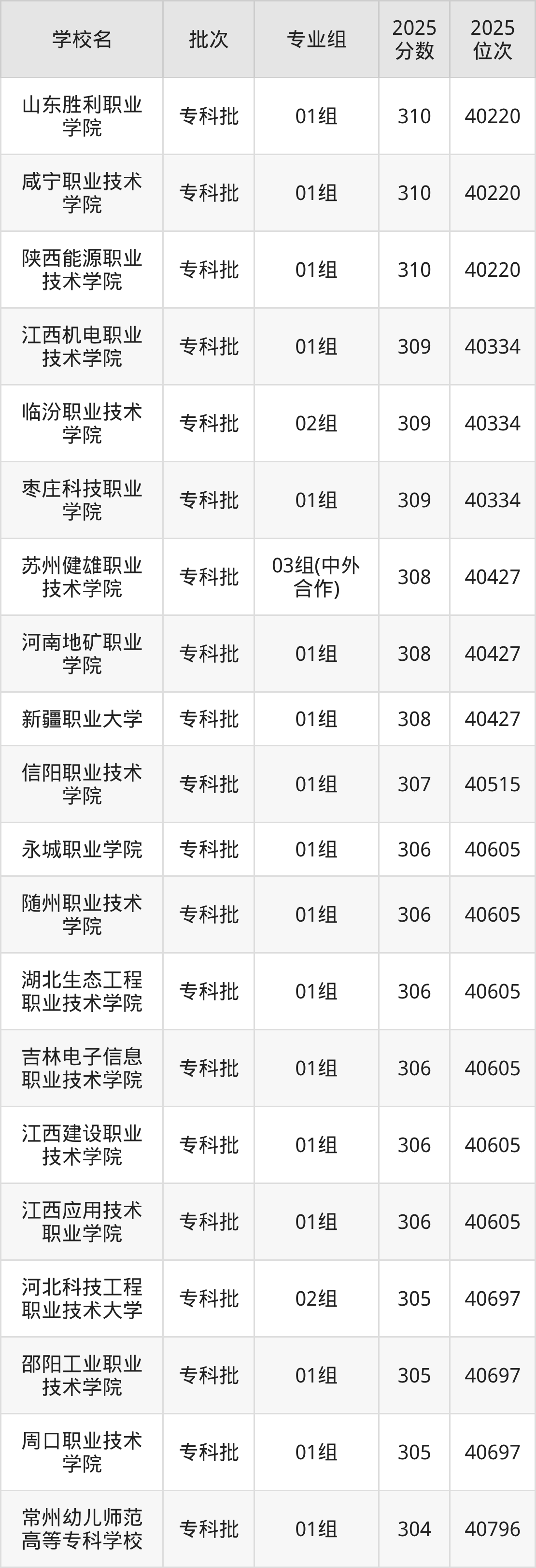 2025年江苏高考历史类305分(40606名~40697名)能上的大学有河北科技工程职业技术大学02组、周口职业技术学院01组、邵阳工业职业技术学院01组。