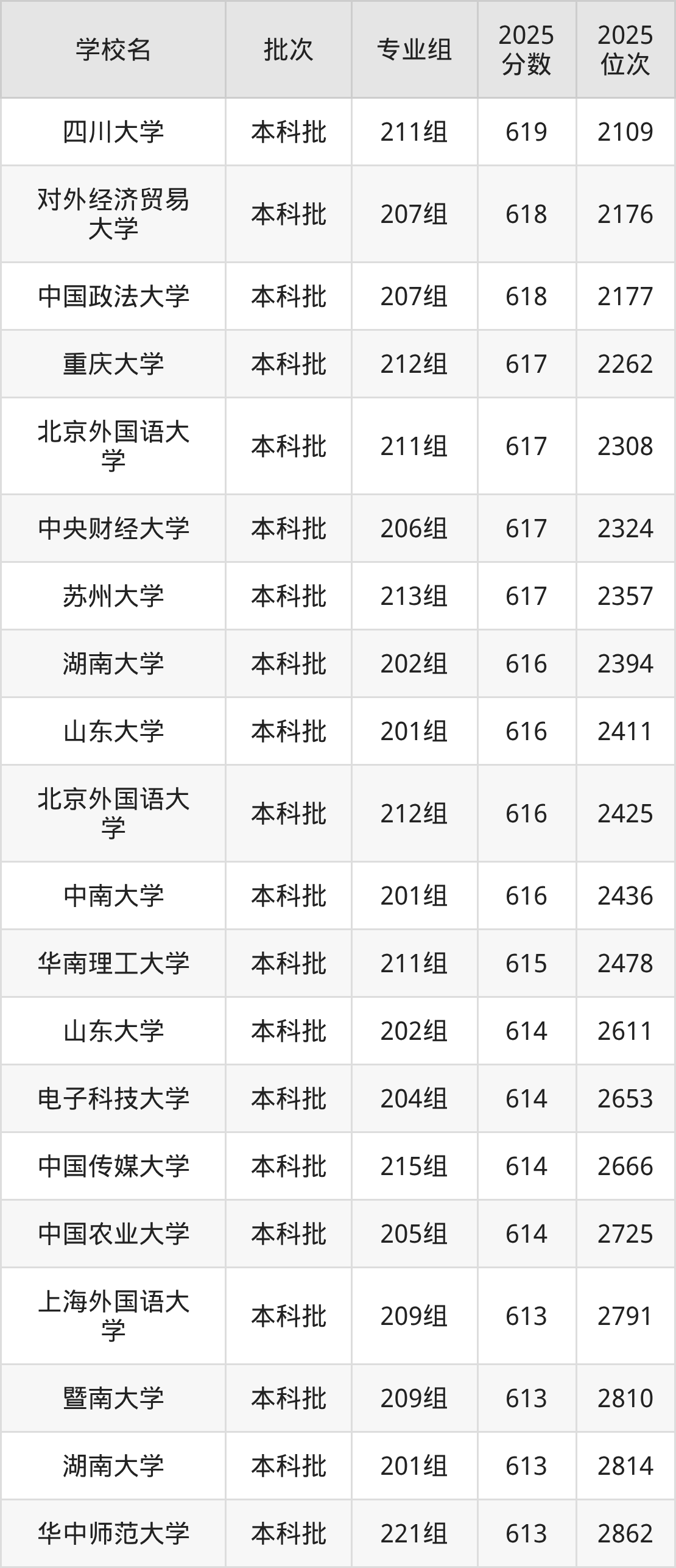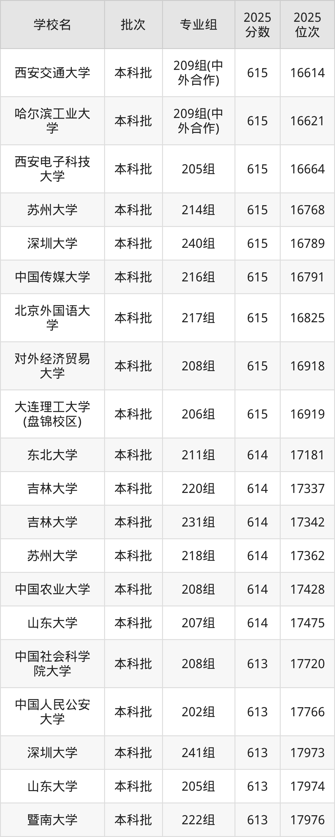 2025年广东高考历史类614分(2598名~2753名)能上的大学有中国农业大学205组、中国传媒大学215组、山东大学202组、电子科技大学204组。
