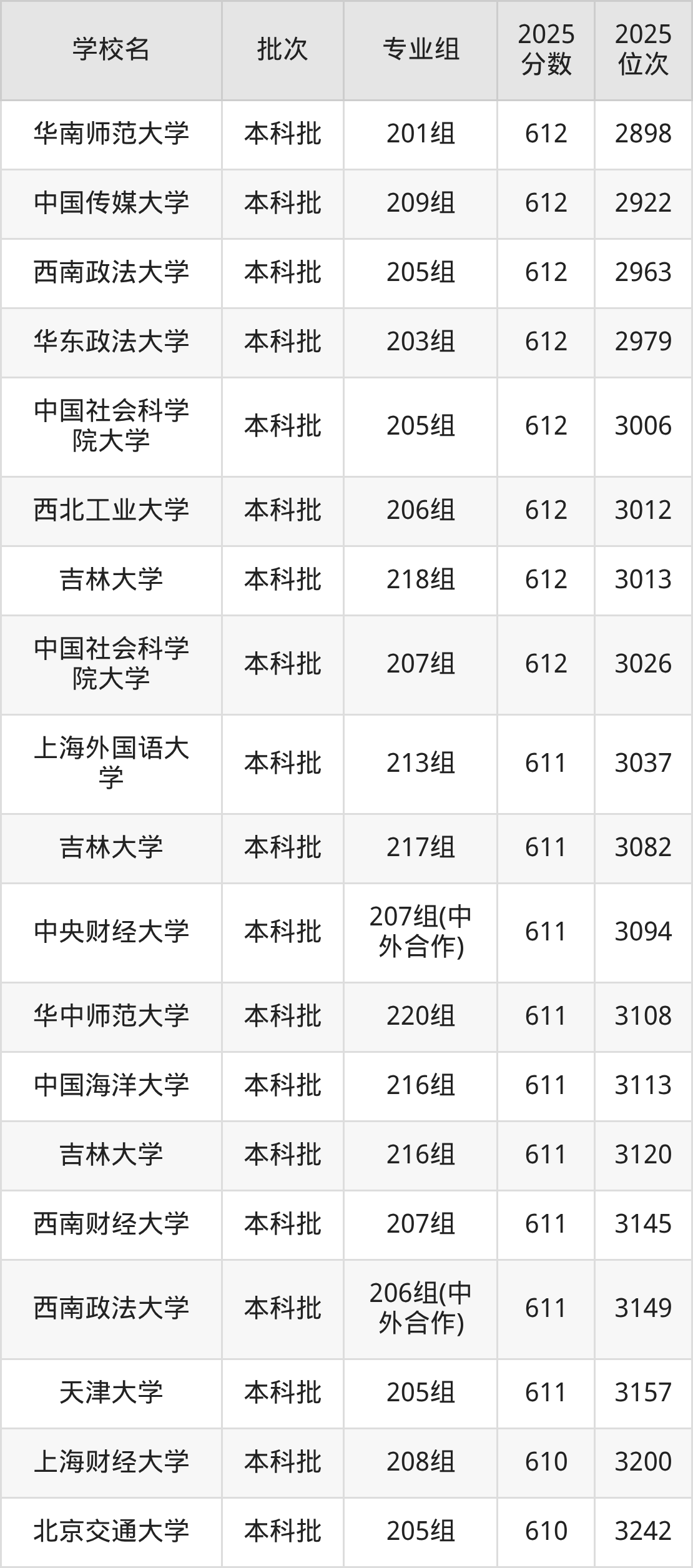 这些都是2026年高考历史类2598名~2753名考生可以报考的大学,更多学校名单如下表所示: