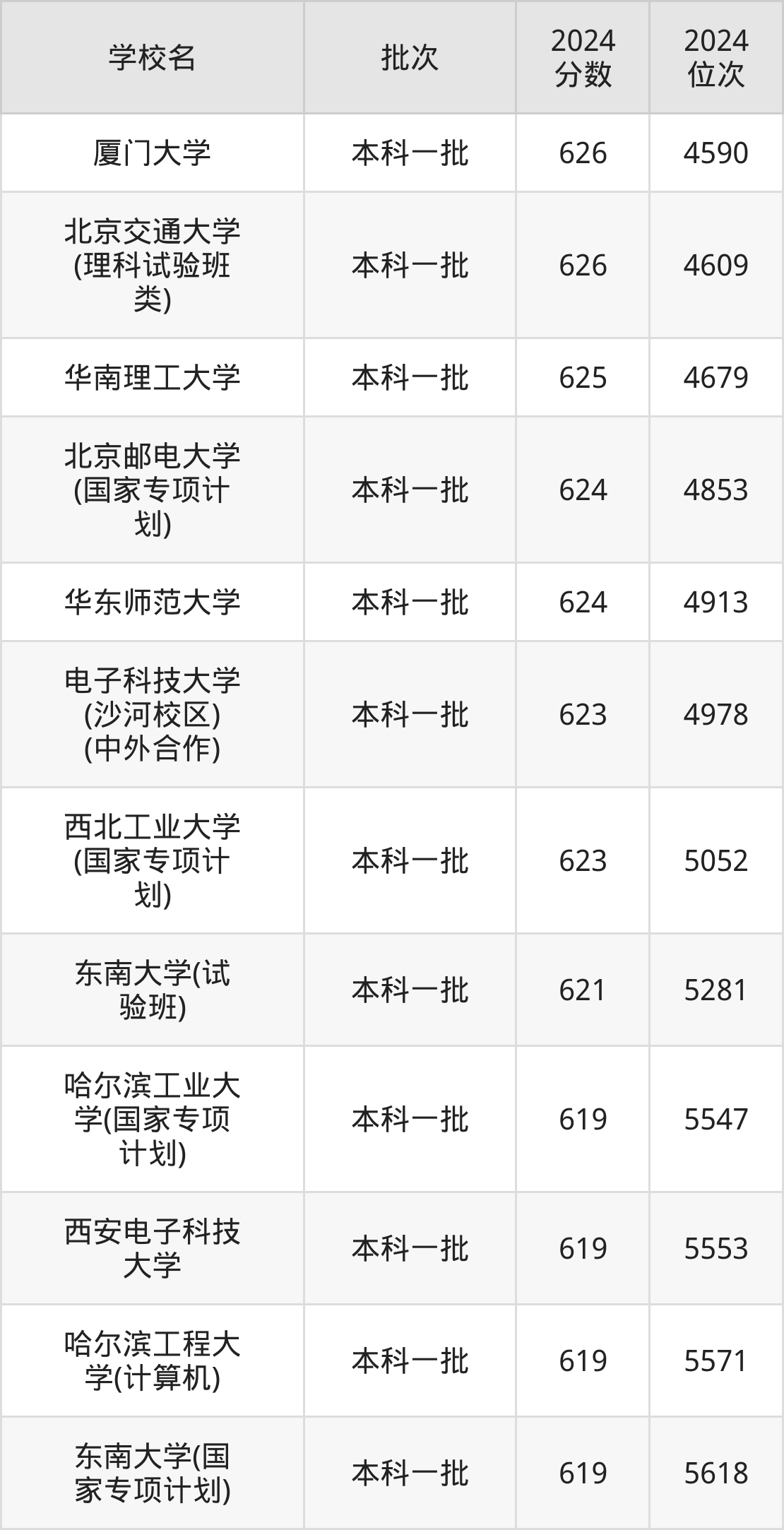 2024年陕西高考理科622分(5075名~5192名)录取位次低于该区间(较稳妥)的有东南大学(试验班)(5281名)、哈尔滨工业大学(国家专项计划)(5547名)等;录取位次高于该区间(可冲)的有西北工业大学(国家专项计划)(5052名)、电子科技大学(沙河校区)(中外合作)(4978名)等。