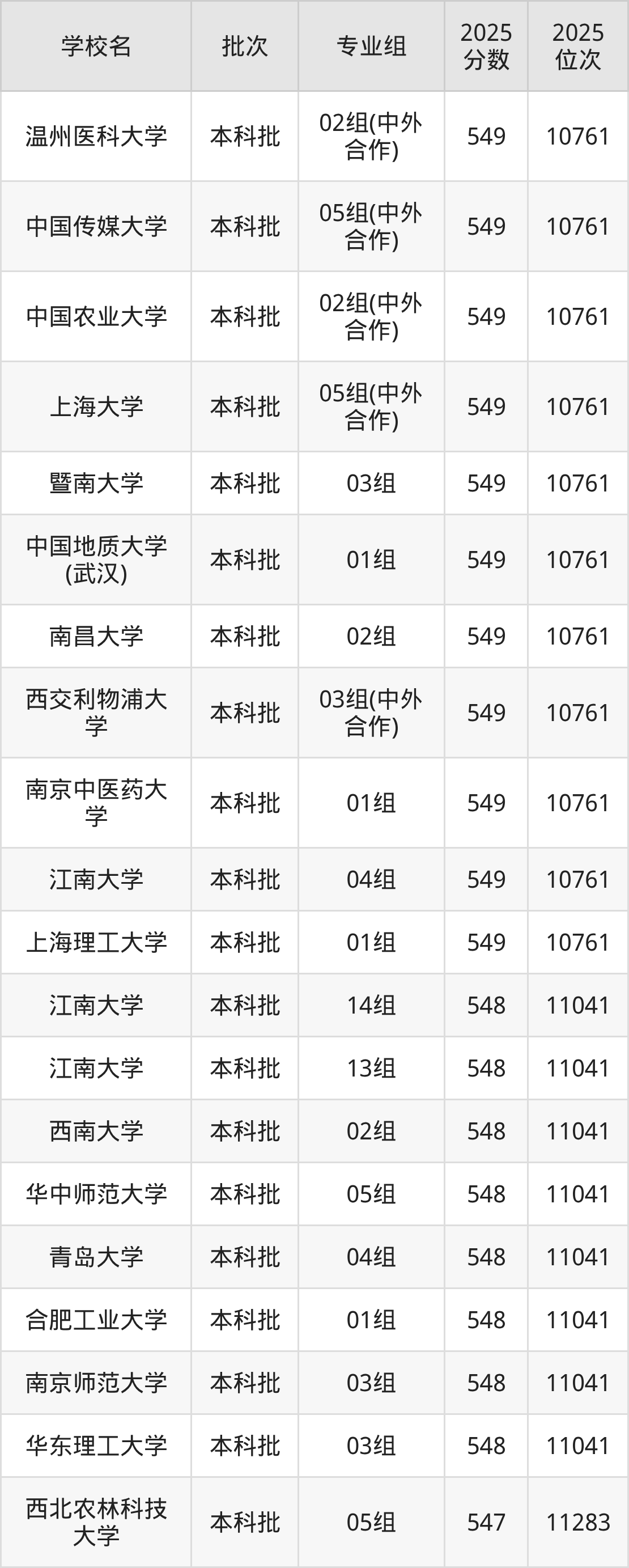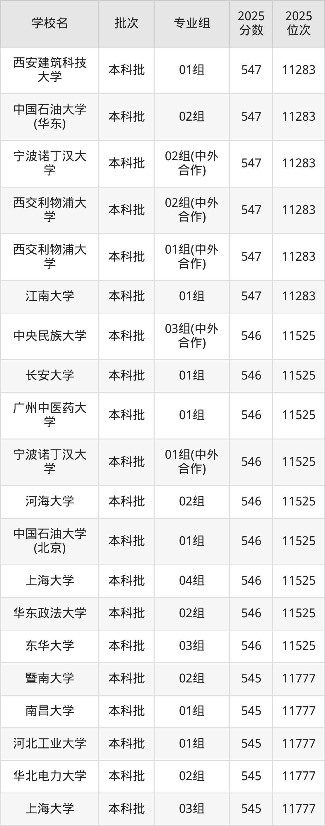 2025年上海高考547分(11042名~11283名)能上的大学有江南大学01组、西交利物浦大学01组(中外合作)、西交利物浦大学02组(中外合作)、宁波诺丁汉大学02组(中外合作)等。