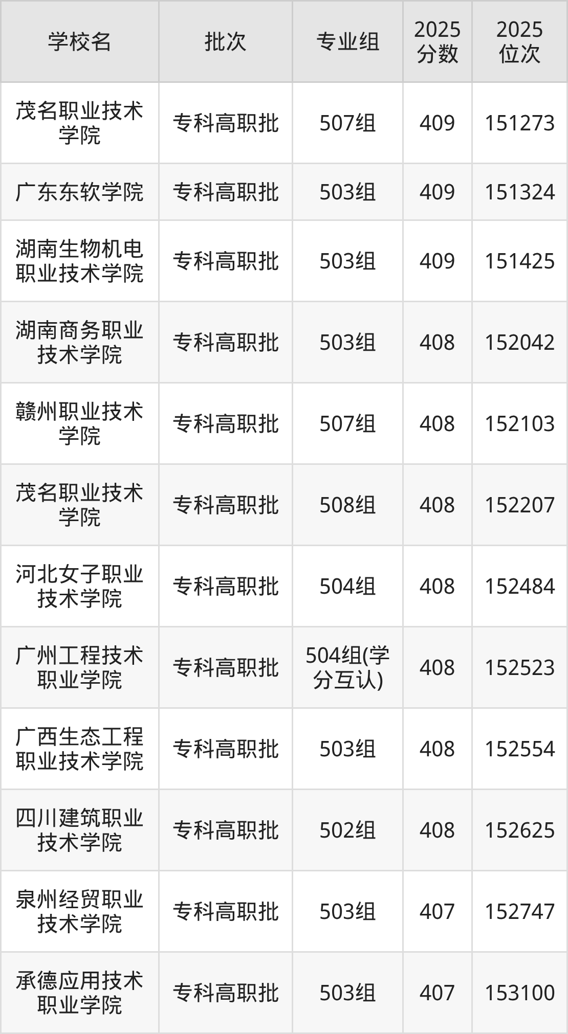2025年广东高考历史类408分(151586名~152613名)能上的大学有广西生态工程职业技术学院503组、湖南商务职业技术学院503组、四川建筑职业技术学院502组、广州工程技术职业学院504组(学分互认)等。