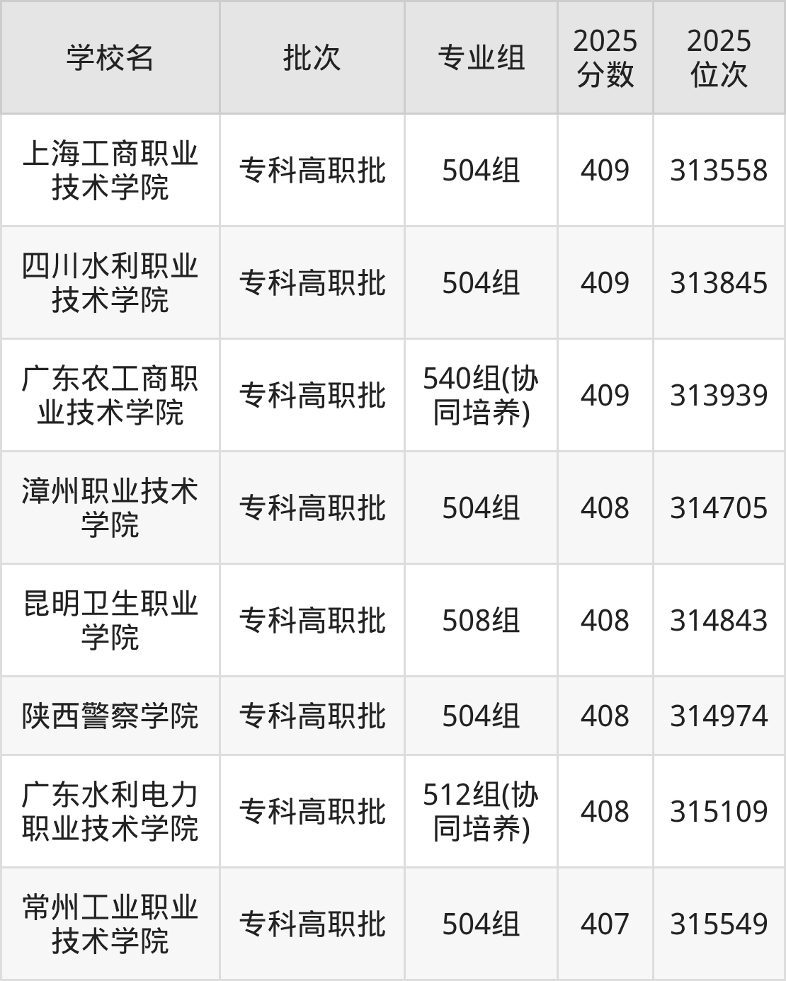2025年广东高考物理类408分(314020名~315278名)能上的大学有广东水利电力职业技术学院512组(协同培养)、漳州职业技术学院504组、陕西警察学院504组、昆明卫生职业学院508组。