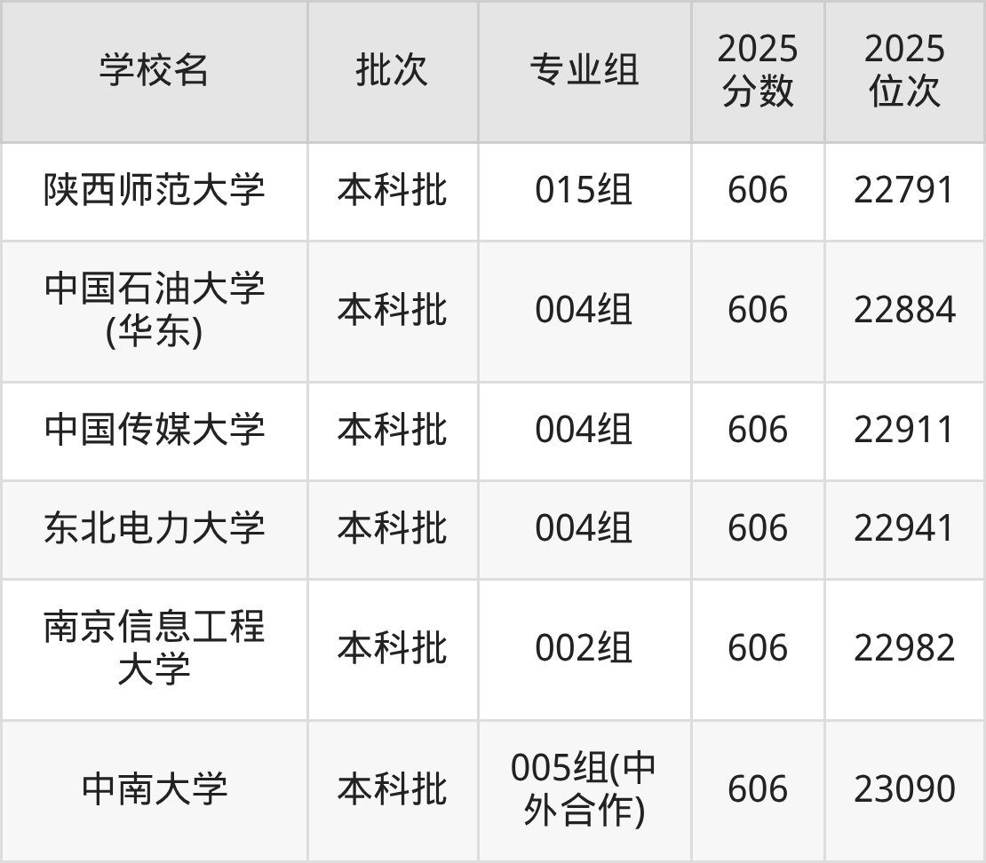 另外录取位次低于该区间(较稳妥)的有陕西师范大学015组(22791名)、中国石油大学(华东)004组(22884名)等;录取位次高于该区间(可冲)的有湖南师范大学002组(21979名)、首都师范大学001组(21883名)等。