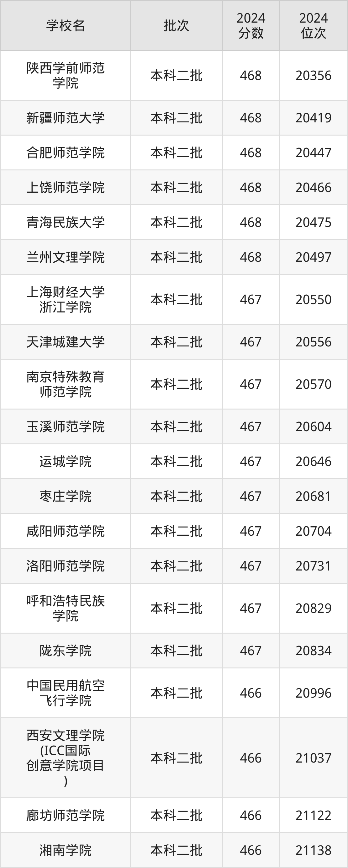 2024年陕西高考文科466分(20836名~21196名)能上的大学有廊坊师范学院、湘南学院、中国民用航空飞行学院、西安文理学院(ICC国际创意学院项目)。