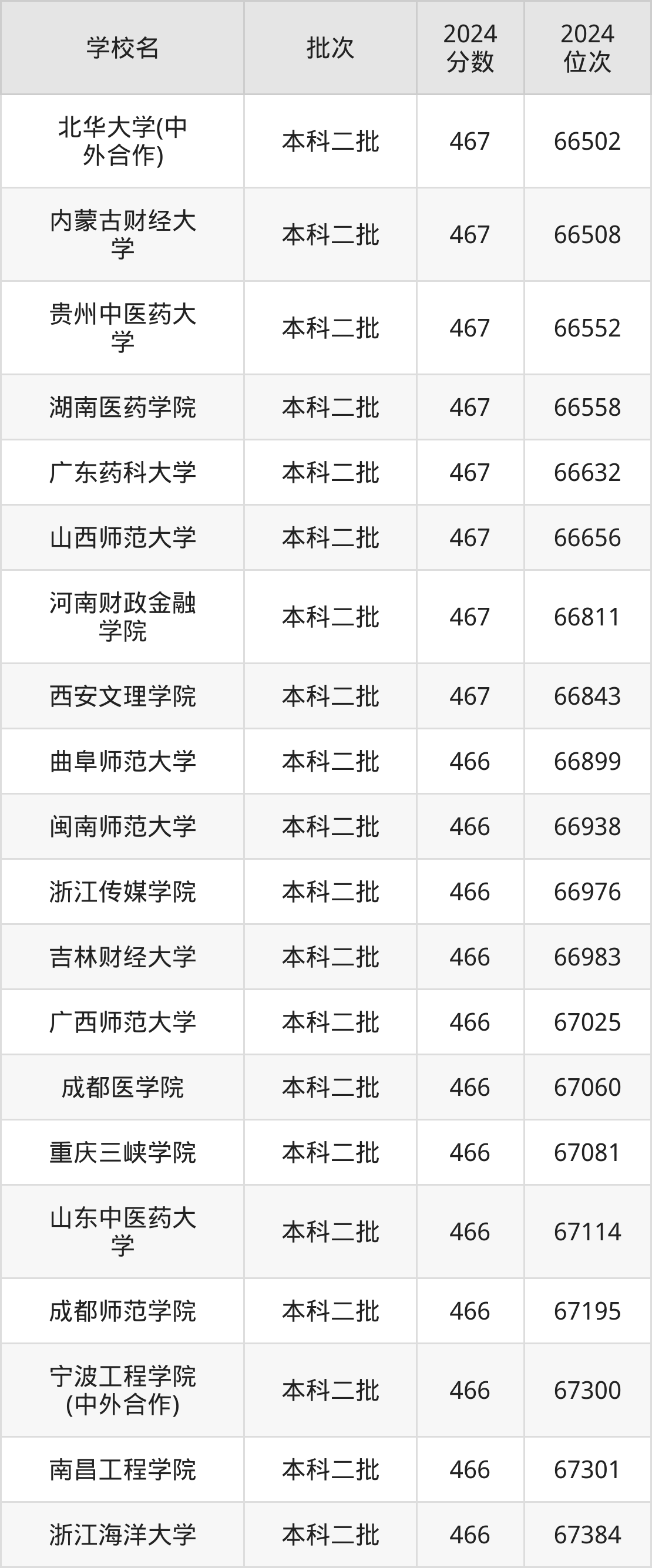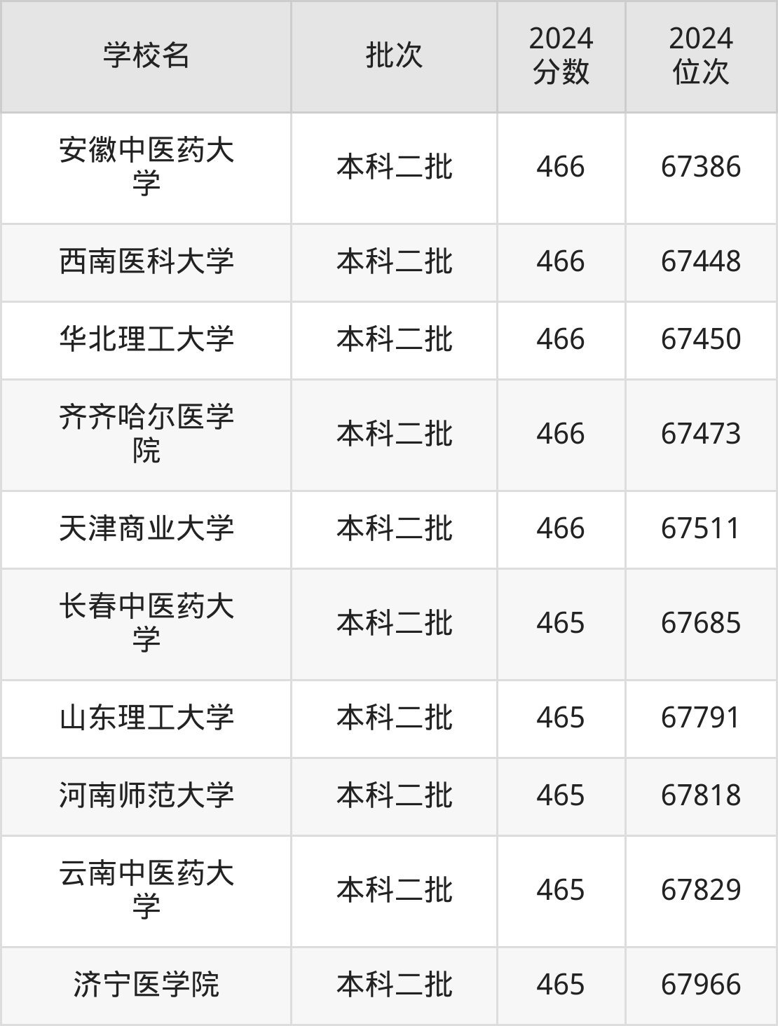 2024年陕西高考理科466分(66862名~67555名)能上的大学有天津商业大学、华北理工大学、吉林财经大学、齐齐哈尔医学院等。