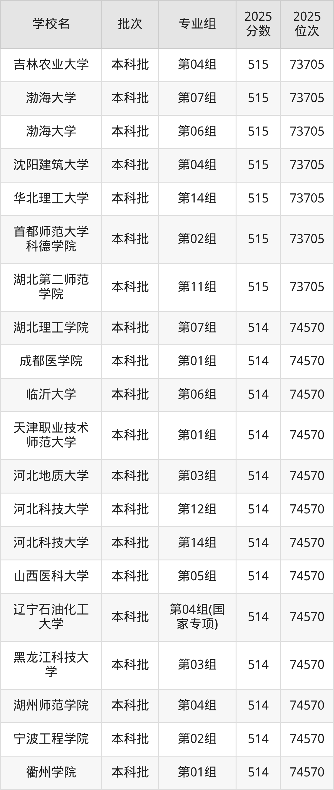 2025年湖北高考物理类514分(73706名~74570名)能上的大学有湖北理工学院第07组、天津职业技术师范大学第01组、河北地质大学第03组、河北科技大学第12组等。