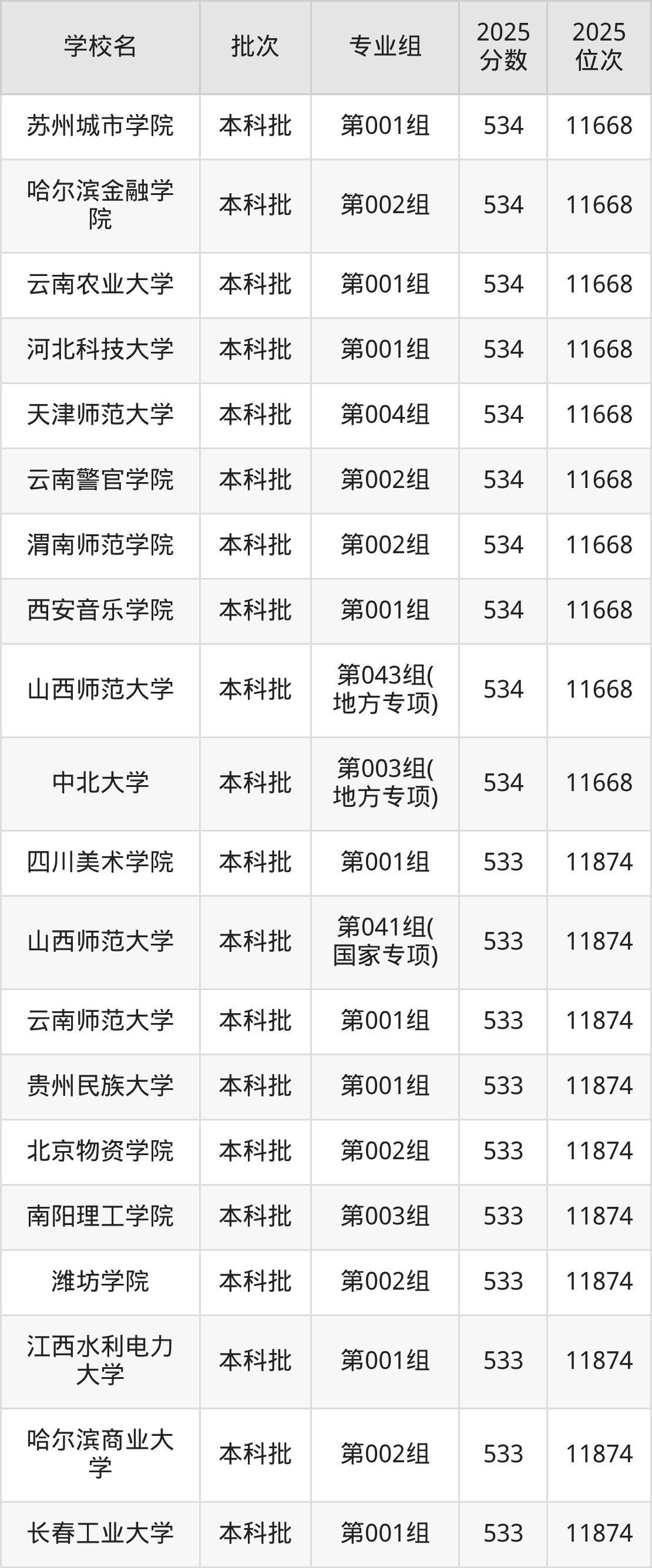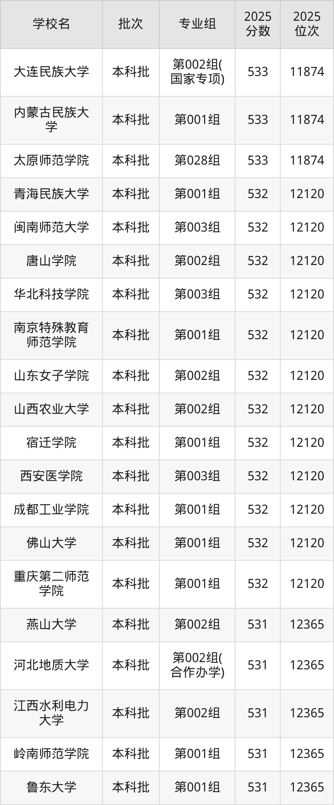 2025年山西高考历史类532分(11875名~12120名)能上的大学有唐山学院第002组、华北科技学院第003组、南京特殊教育师范学院第001组、宿迁学院第001组等。