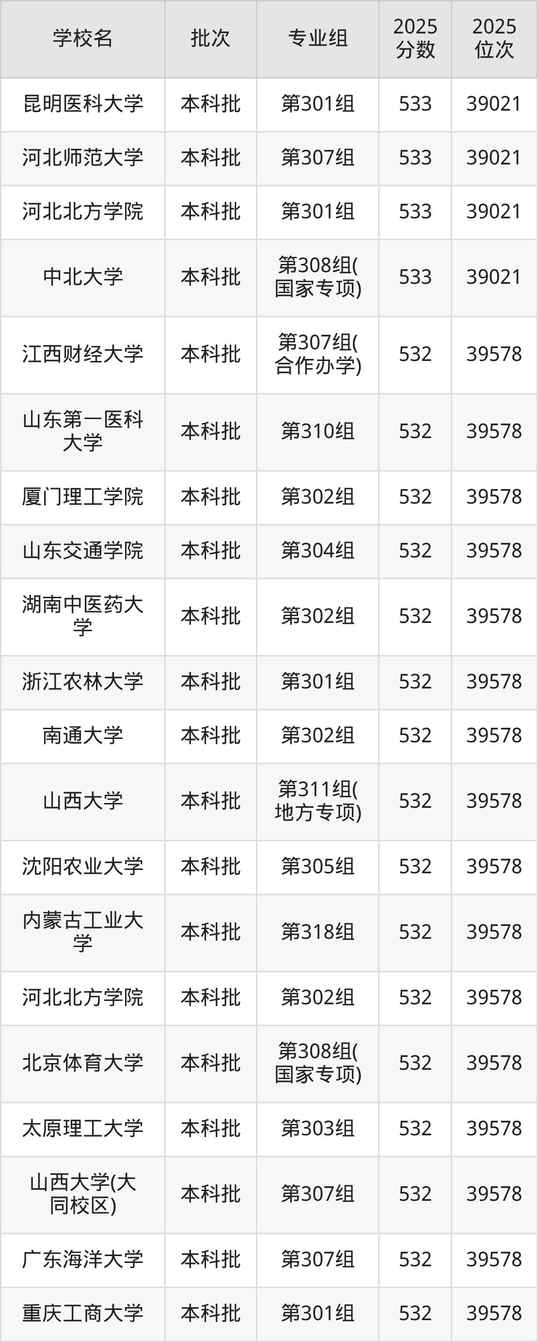 山西高考532分:历史类排名12120位、物理类排名39578位。该分数位次对应能上的大学历史类有唐山学院第002组、华北科技学院第003组;物理类有北京体育大学第308组(国家专项)、河北北方学院第302组,更多名单如下文所示,2026届考生可参考。