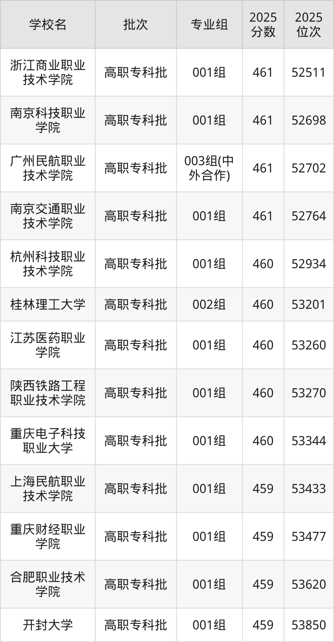 2025年安徽高考历史类460分(52869名~53385名)能上的大学有重庆电子科技职业大学001组、桂林理工大学002组、杭州科技职业技术学院001组、江苏医药职业学院001组等。