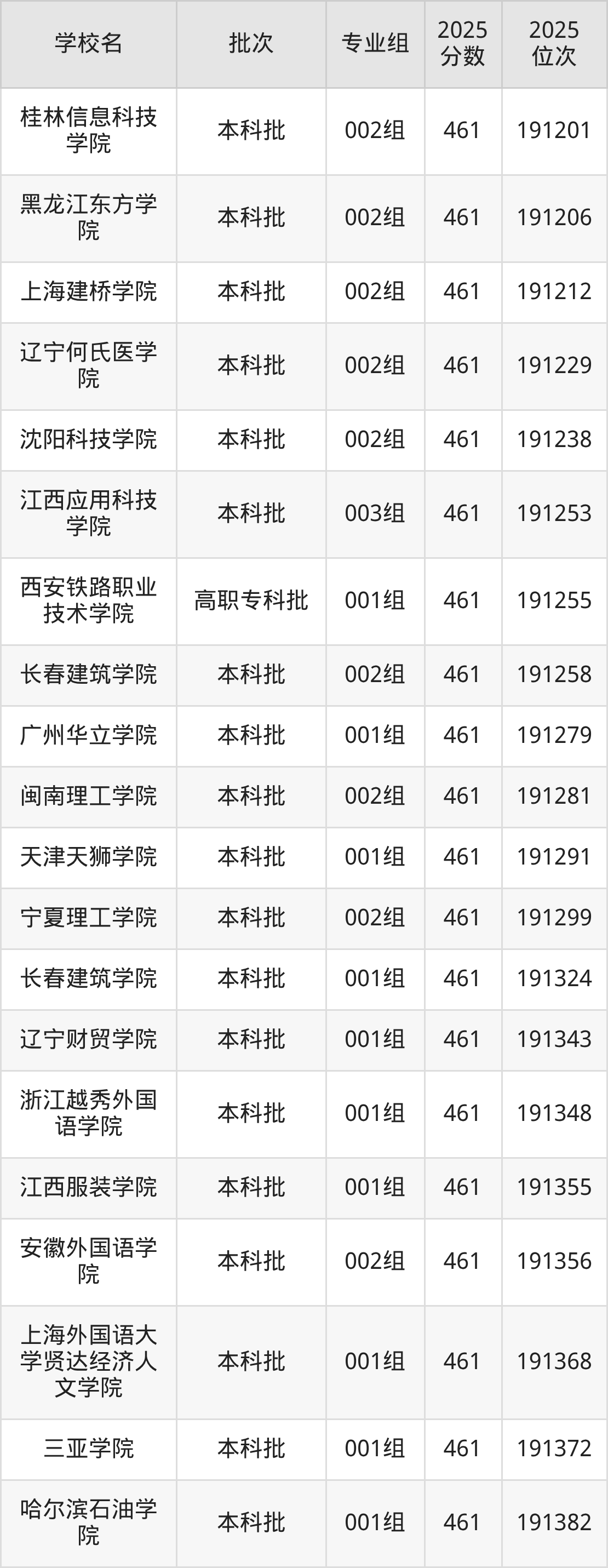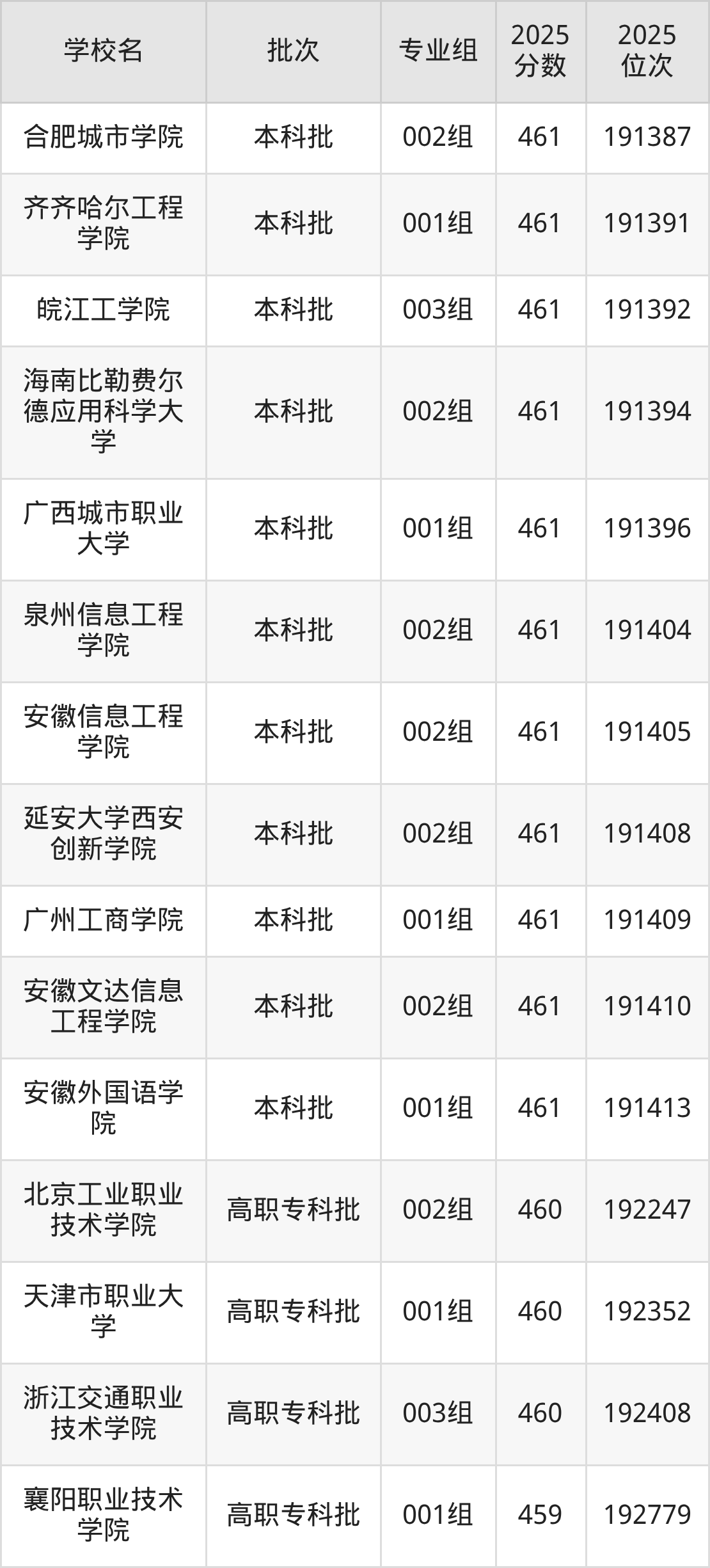 2025年安徽高考物理类460分(191417名~192766名)能上的大学有北京工业职业技术学院002组、天津市职业大学001组、浙江交通职业技术学院003组。