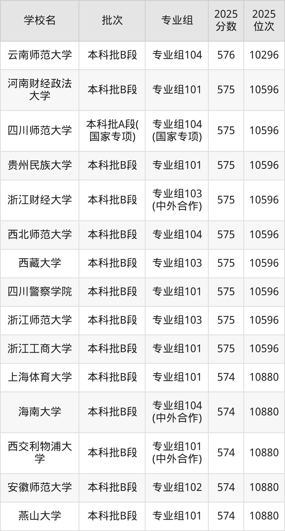 2025年四川高考历史类575分(10297名~10596名)能上的大学有四川师范大学专业组104(国家专项)、浙江工商大学专业组101、浙江师范大学专业组103、四川警察学院专业组101等。