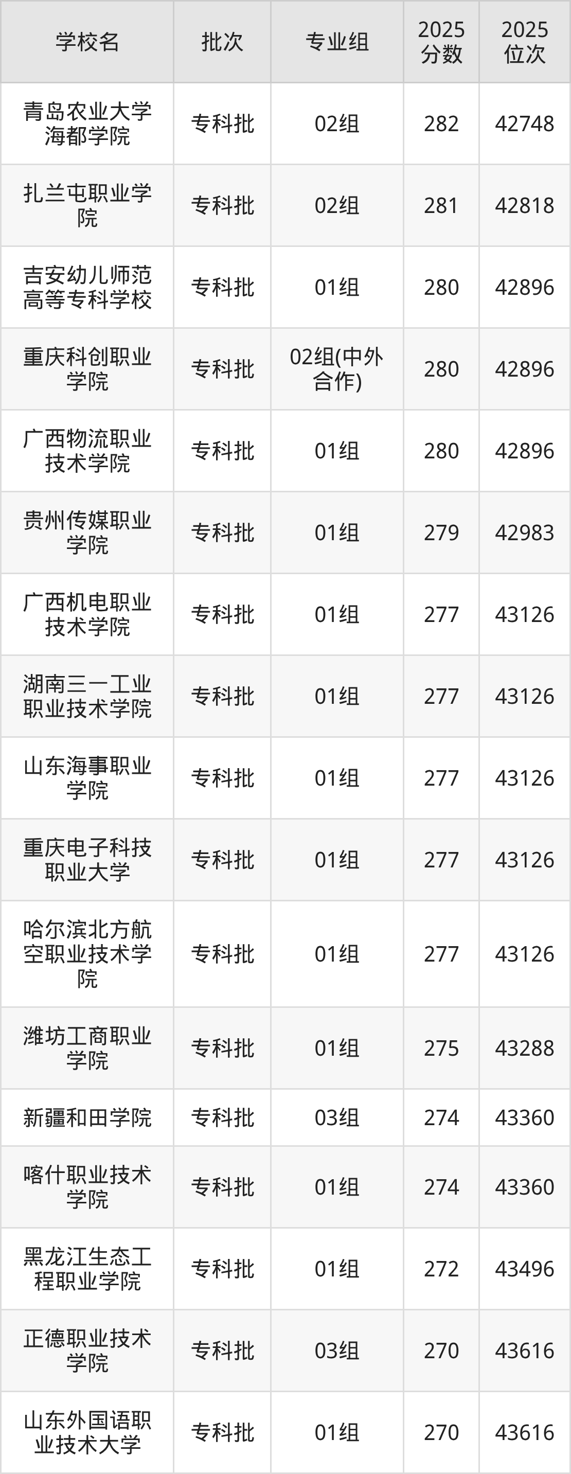 另外录取位次低于该区间(较稳妥)的有潍坊工商职业学院01组(43288名)、喀什职业技术学院01组(43360名)等;录取位次高于该区间(可冲)的有贵州传媒职业学院01组(42983名)、重庆科创职业学院02组(中外合作)(42896名)等。