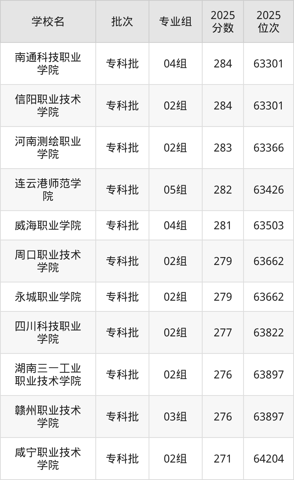 另外录取位次低于该区间(较稳妥)的有湖南三一工业职业技术学院02组(63897名)、赣州职业技术学院03组(63897名)等;录取位次高于该区间(可冲)的有周口职业技术学院02组(63662名)、永城职业学院02组(63662名)等。