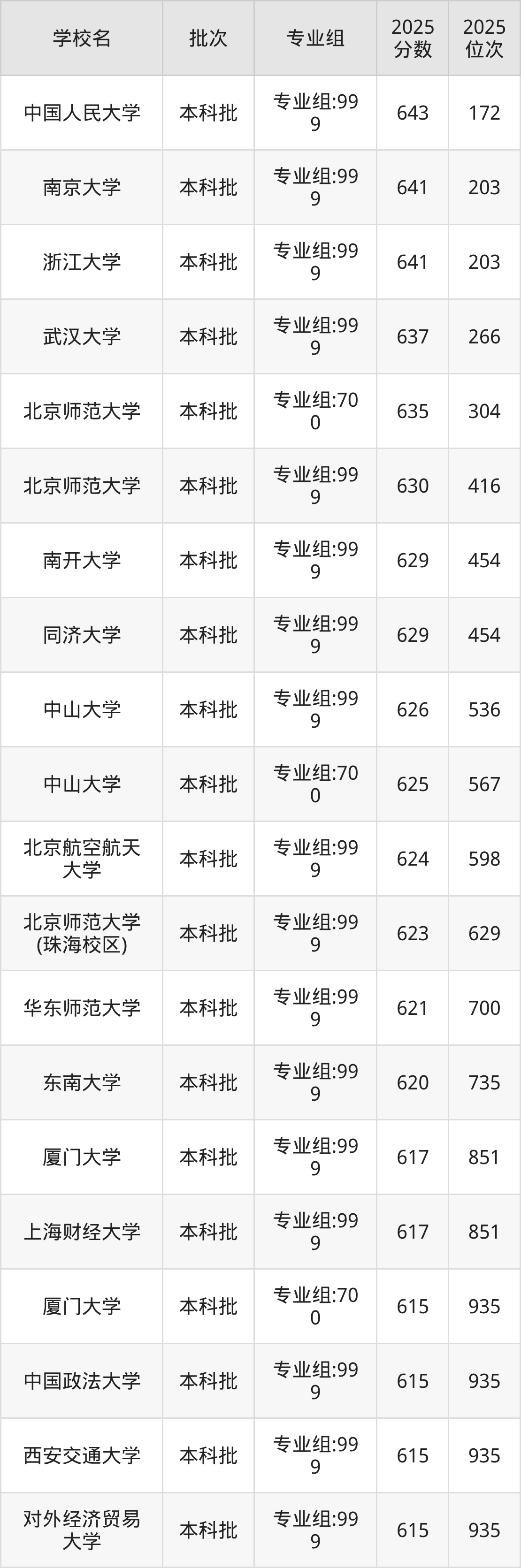 另外录取位次低于该区间(较稳妥)的有东南大学专业组:999(735名)、上海财经大学专业组:999(851名)等;录取位次高于该区间(可冲)的有北京师范大学(珠海校区)专业组:999(629名)、北京航空航天大学专业组:999(598名)等。