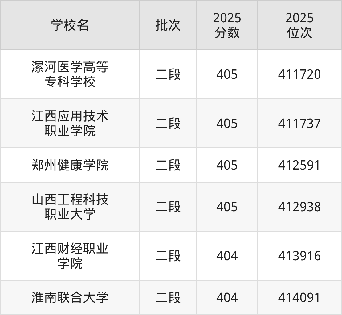 2025年山东高考405分(411680名~413749名)能上的大学有山西工程科技职业大学、江西应用技术职业学院、漯河医学高等专科学校、郑州健康学院。