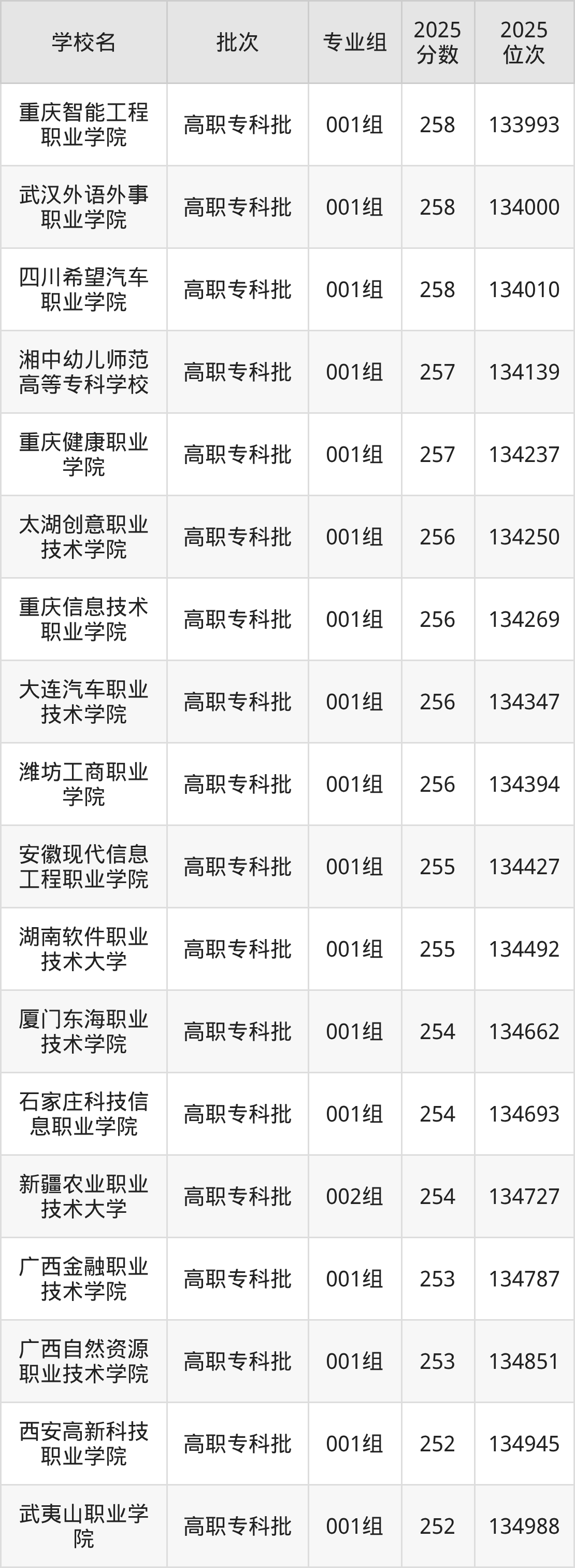 2025年安徽高考历史类255分(134417名~134581名)能上的大学有湖南软件职业技术大学001组、安徽现代信息工程职业学院001组。