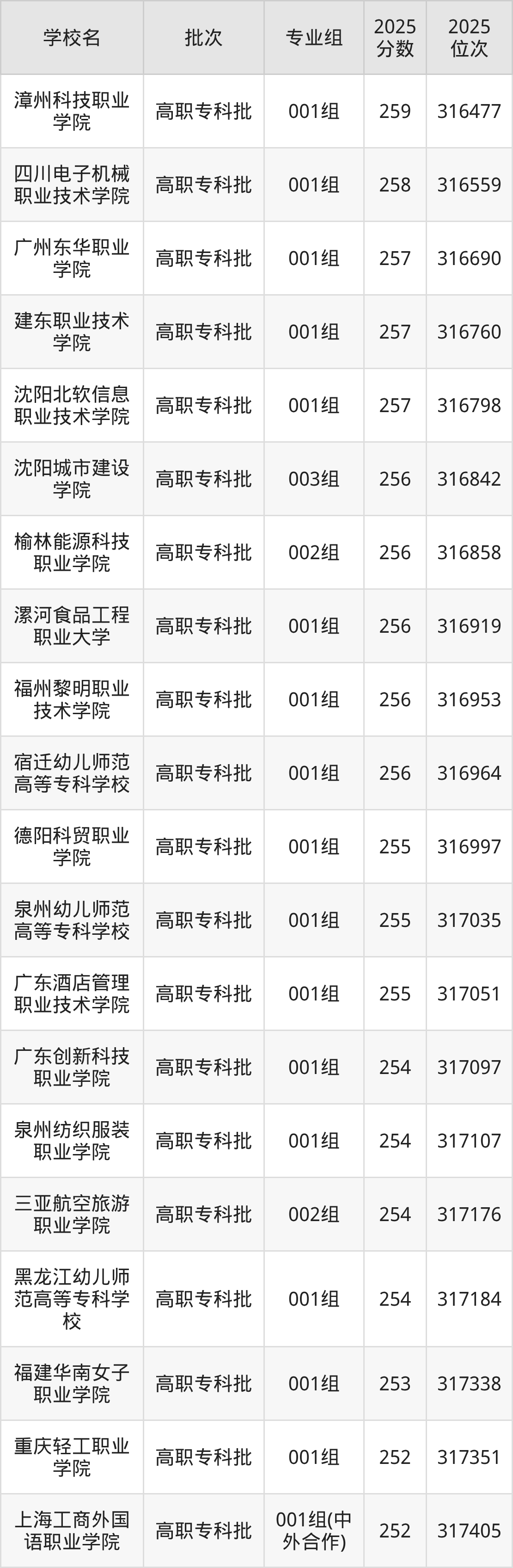 另外录取位次低于该区间(较稳妥)的有广东创新科技职业学院001组(317097名)、泉州纺织服装职业学院001组(317107名)等;录取位次高于该区间(可冲)的有宿迁幼儿师范高等专科学校001组(316964名)、福州黎明职业技术学院001组(316953名)等。