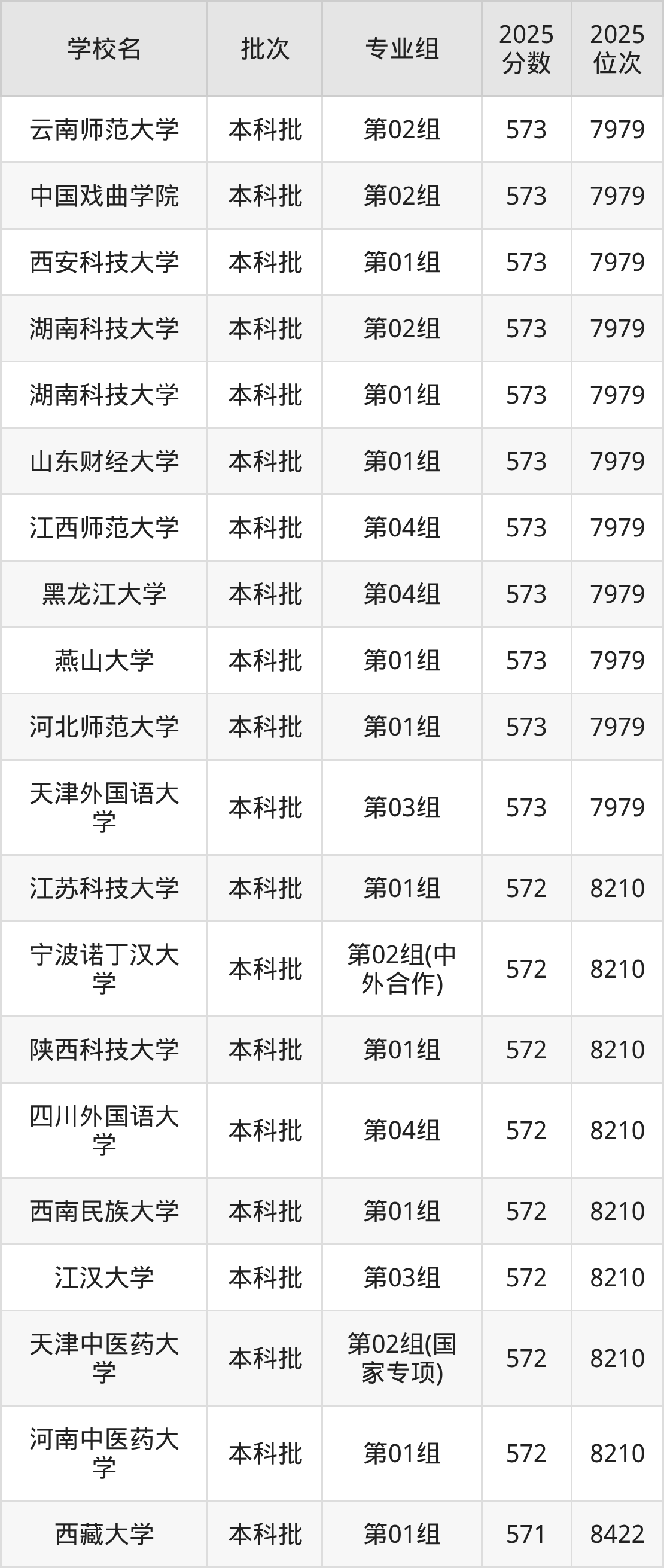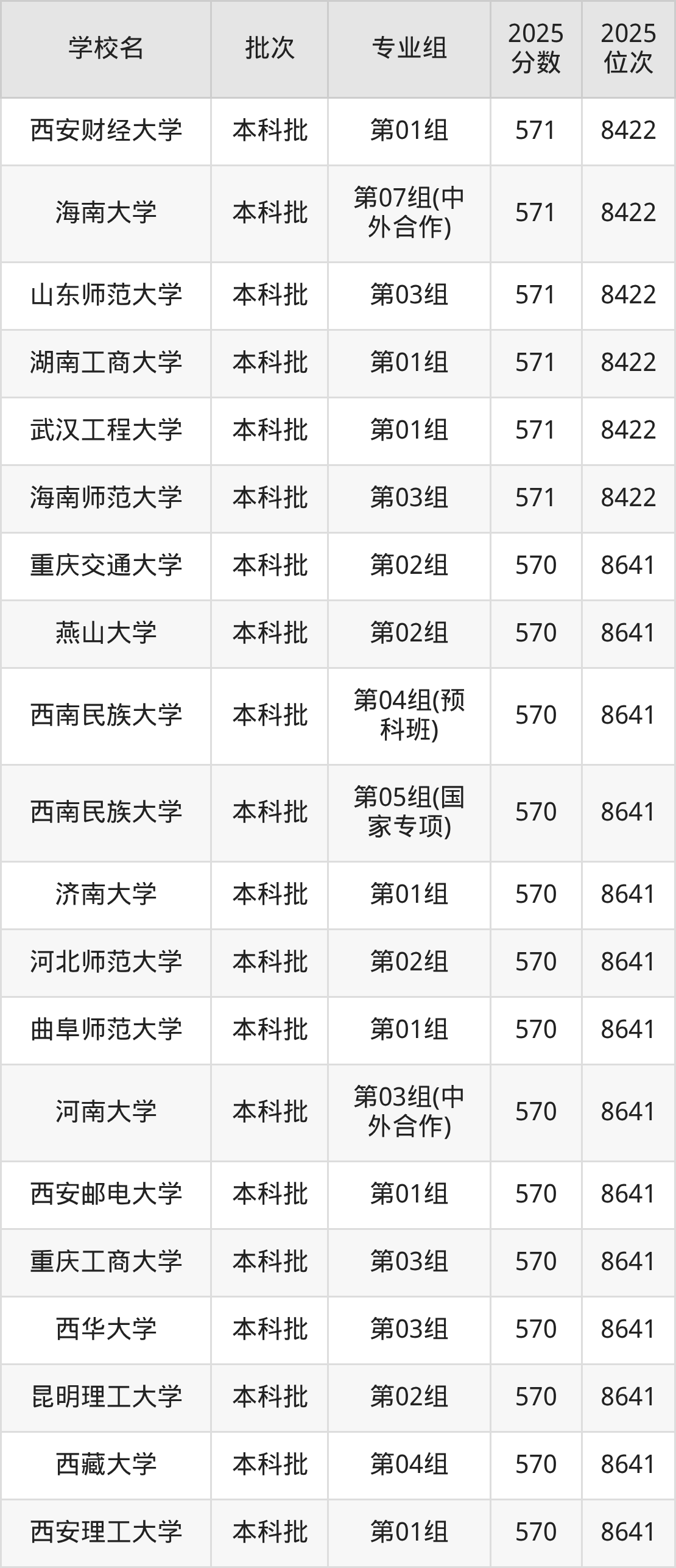 2025年湖北高考历史类570分(8423名~8641名)能上的大学有西南民族大学第04组(预科班)、西南民族大学第05组(国家专项)、河北师范大学第02组、燕山大学第02组等。
