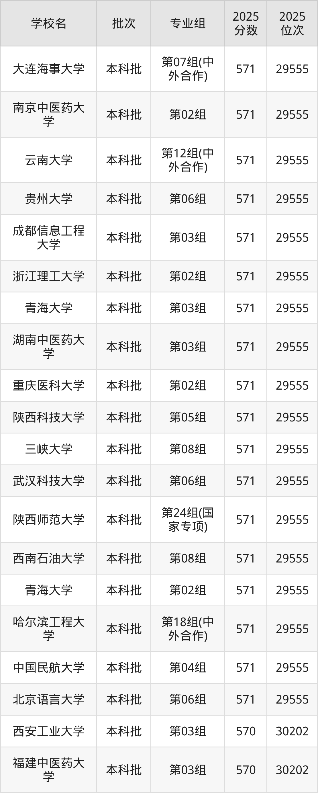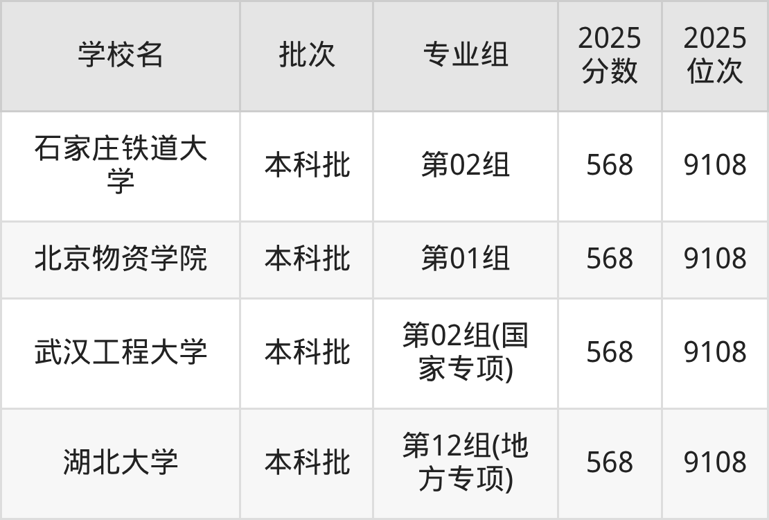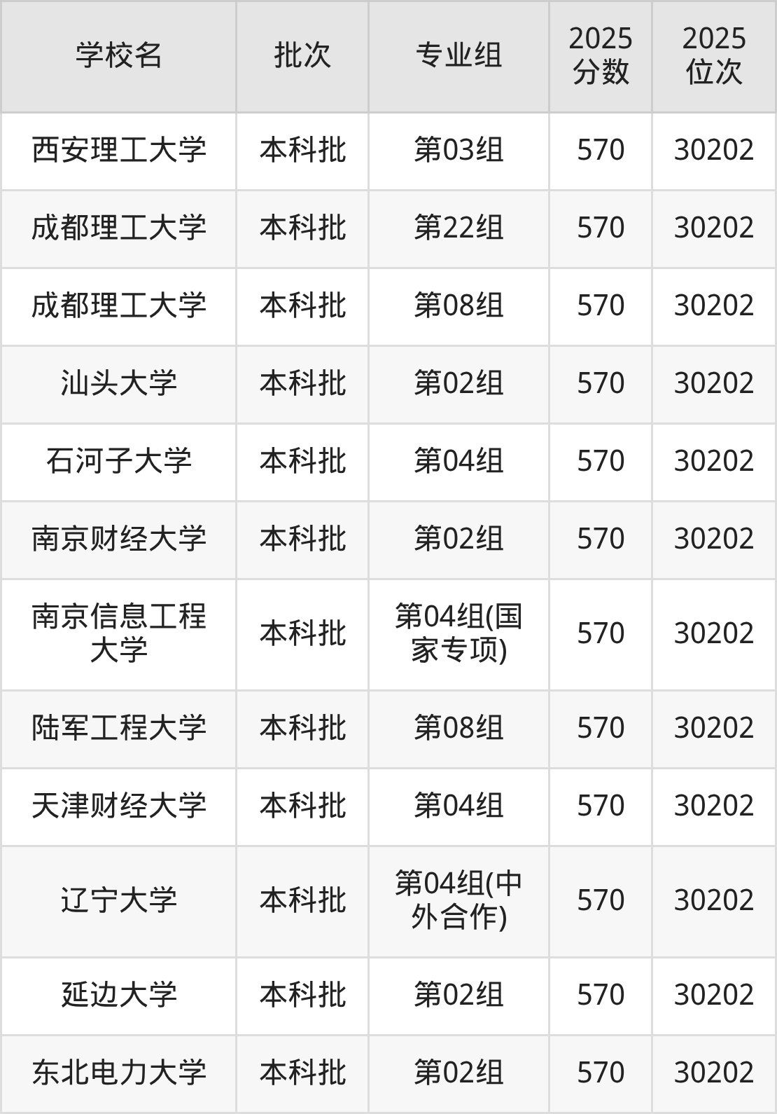 2025年湖北高考物理类570分(29556名~30202名)能上的大学有陆军工程大学第08组、天津财经大学第04组、辽宁大学第04组(中外合作)、延边大学第02组等。