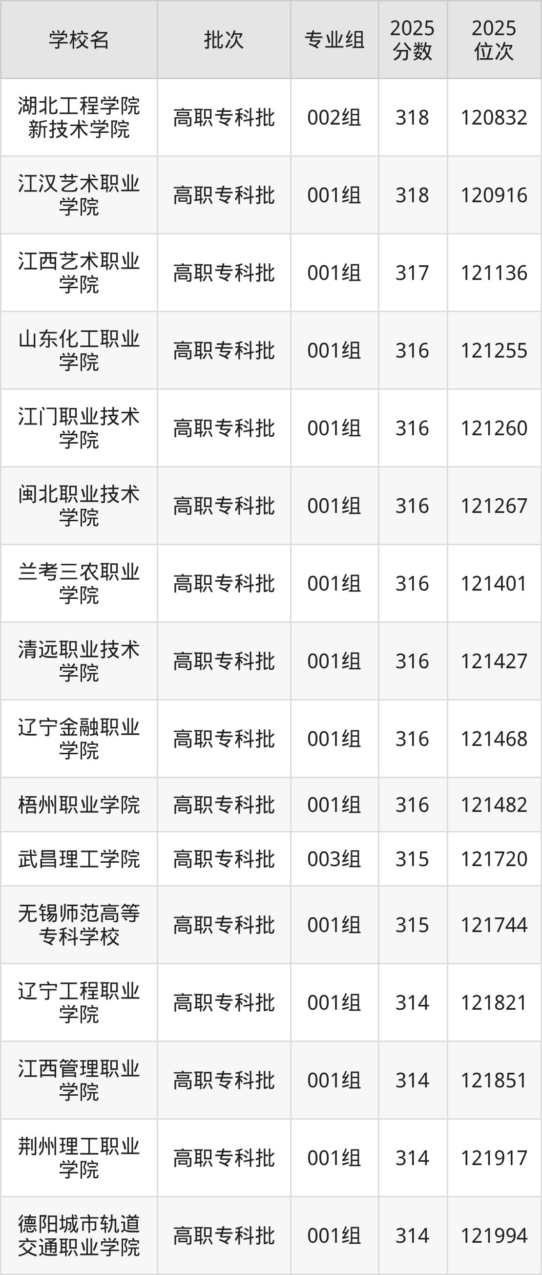 2025年安徽高考历史类316分(121228名~121517名)能上的大学有江门职业技术学院001组、兰考三农职业学院001组、辽宁金融职业学院001组、闽北职业技术学院001组等。